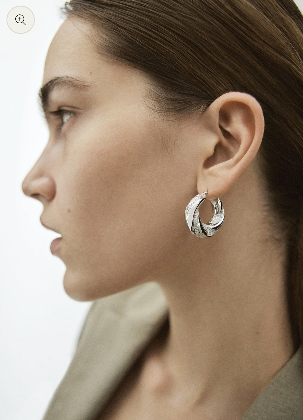 Chunky vridde ringøredobber med en kontrast av polerte og strukturerte overflater i messing med hvit rhodium.