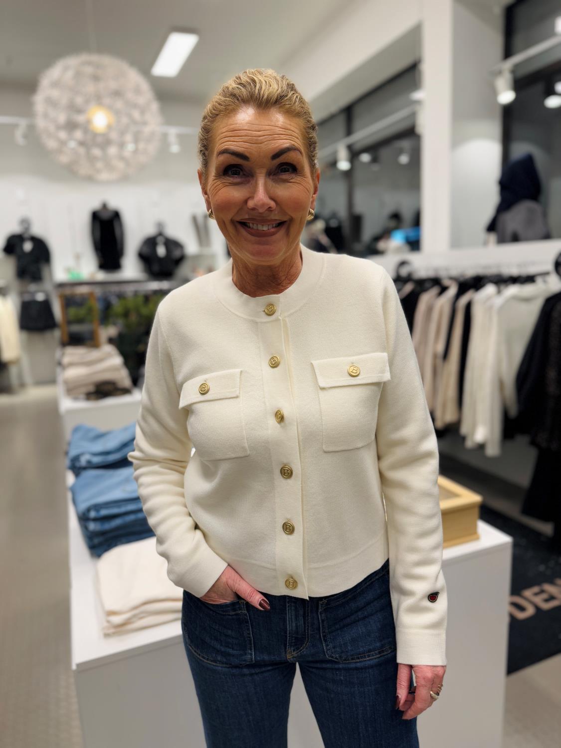 En pen, feminin jakke i kjent Busnel stil. Kort passform, rett i fasongen. Lekre signaturknapper foran.