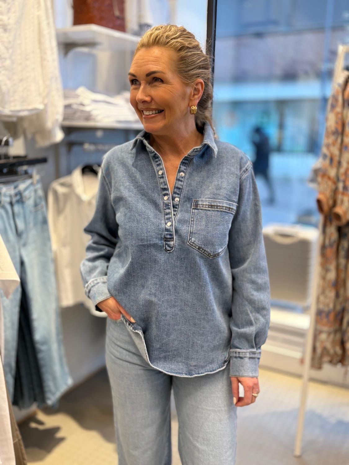 En kul og avslappet denimbluse med krage lange ermer og knappelukking i halsen.