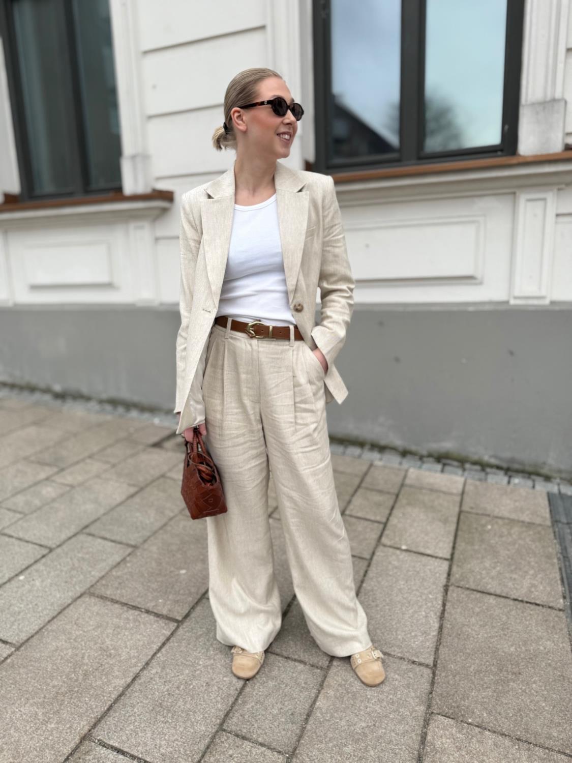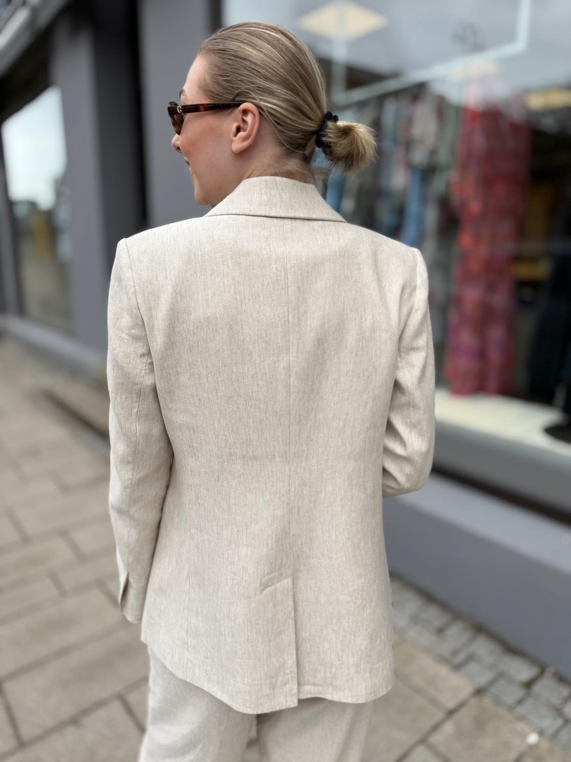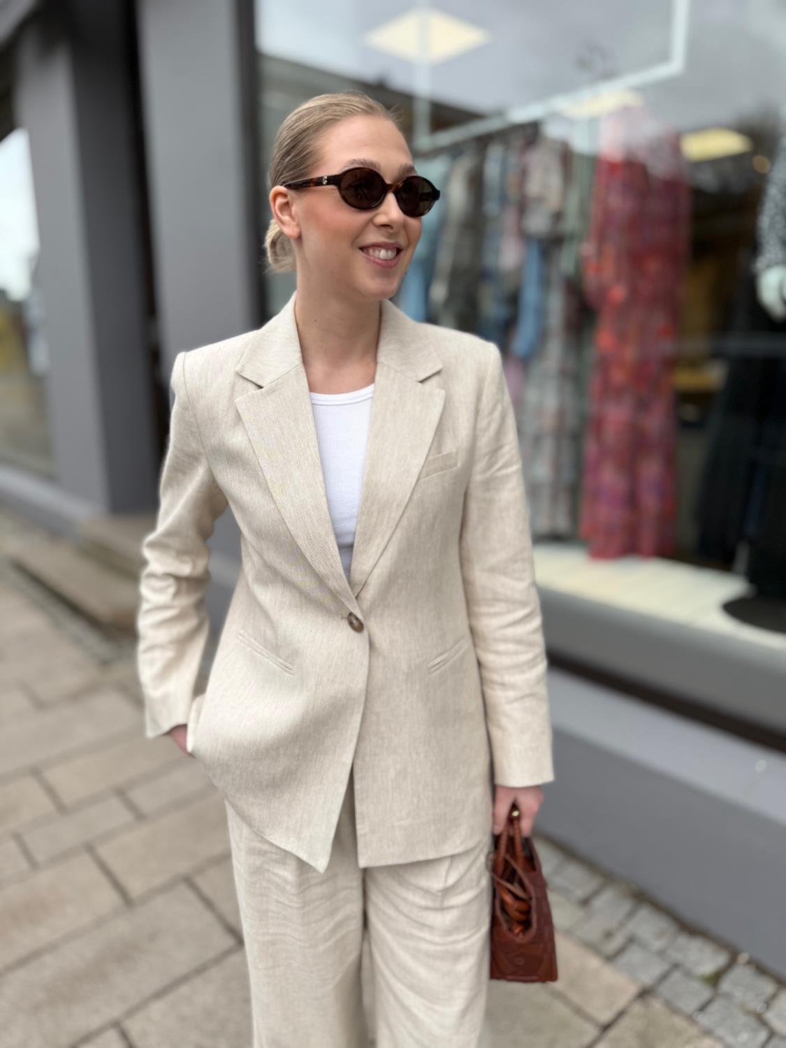 Antonia Blazer fra Camilla Pihl er en enkeltspent blazer, laget i en myk linblanding. Har polstret skulder, passpolerte lommer og splitt bak og i enden av ermene. Blazeren er helfôret.