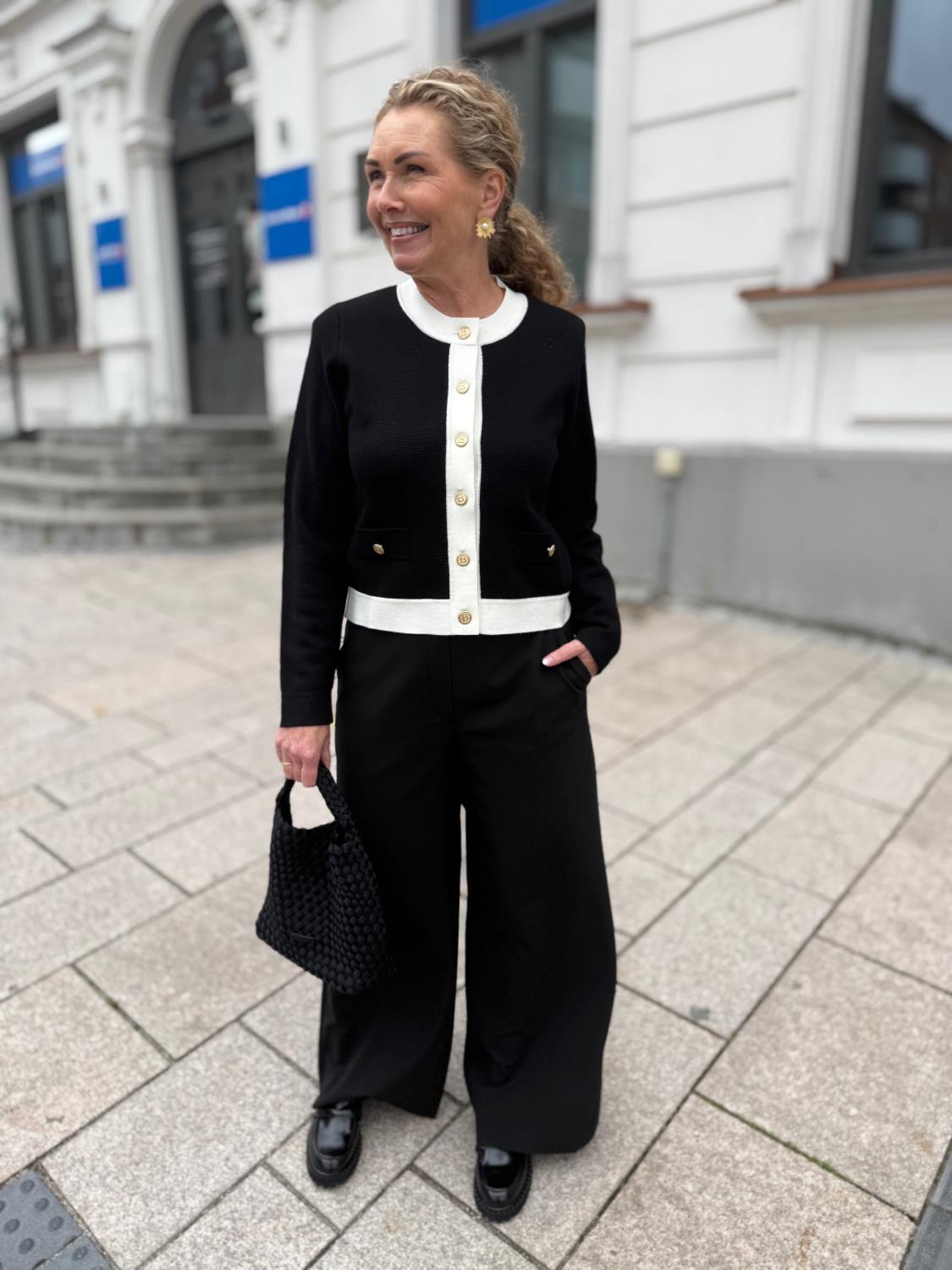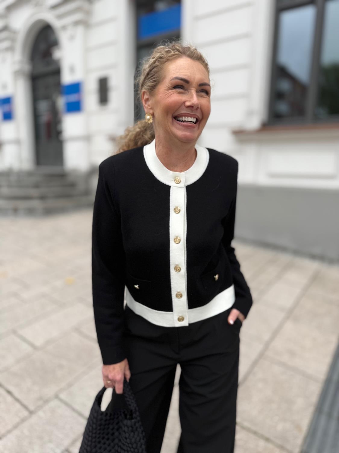 Aria Cardigan fra Busnel er en cardigan som kombinerer klassisk eleganse med luksuriøse detaljer. Jakken er strikket i eksklusiv ull og har en tidløs sort farge med kontrastkanter i off-white, som gir plagget en sofistikert og stilsikker look.
