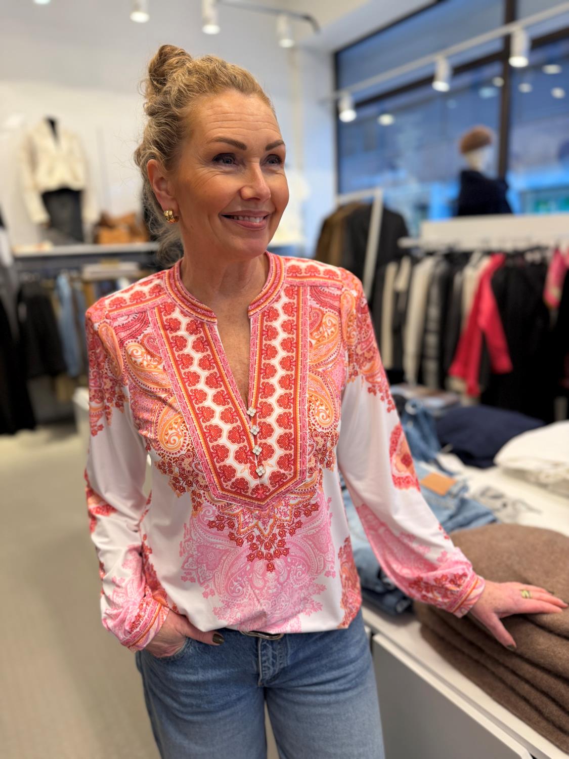 Azaria Top fra Busnel er en elegant og feminin bluse med et eksklusivt uttrykk. Toppen har et vakkert, dekorativt mønster i varme rosatoner og delikate detaljer som gir et sofistikert, men samtidig avslappet preg. Den flatterende V-halsen med broderte detaljer tilfører et luksuriøst touch, mens de lange ermene med lett volum og mansjetter skaper en tidløs silhuett.