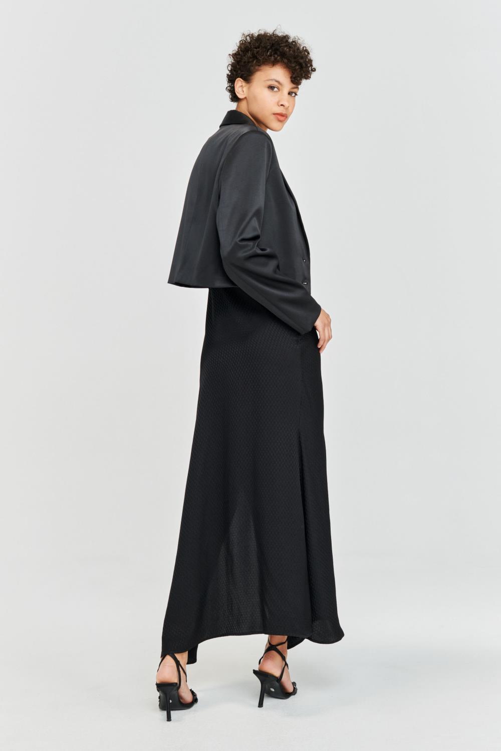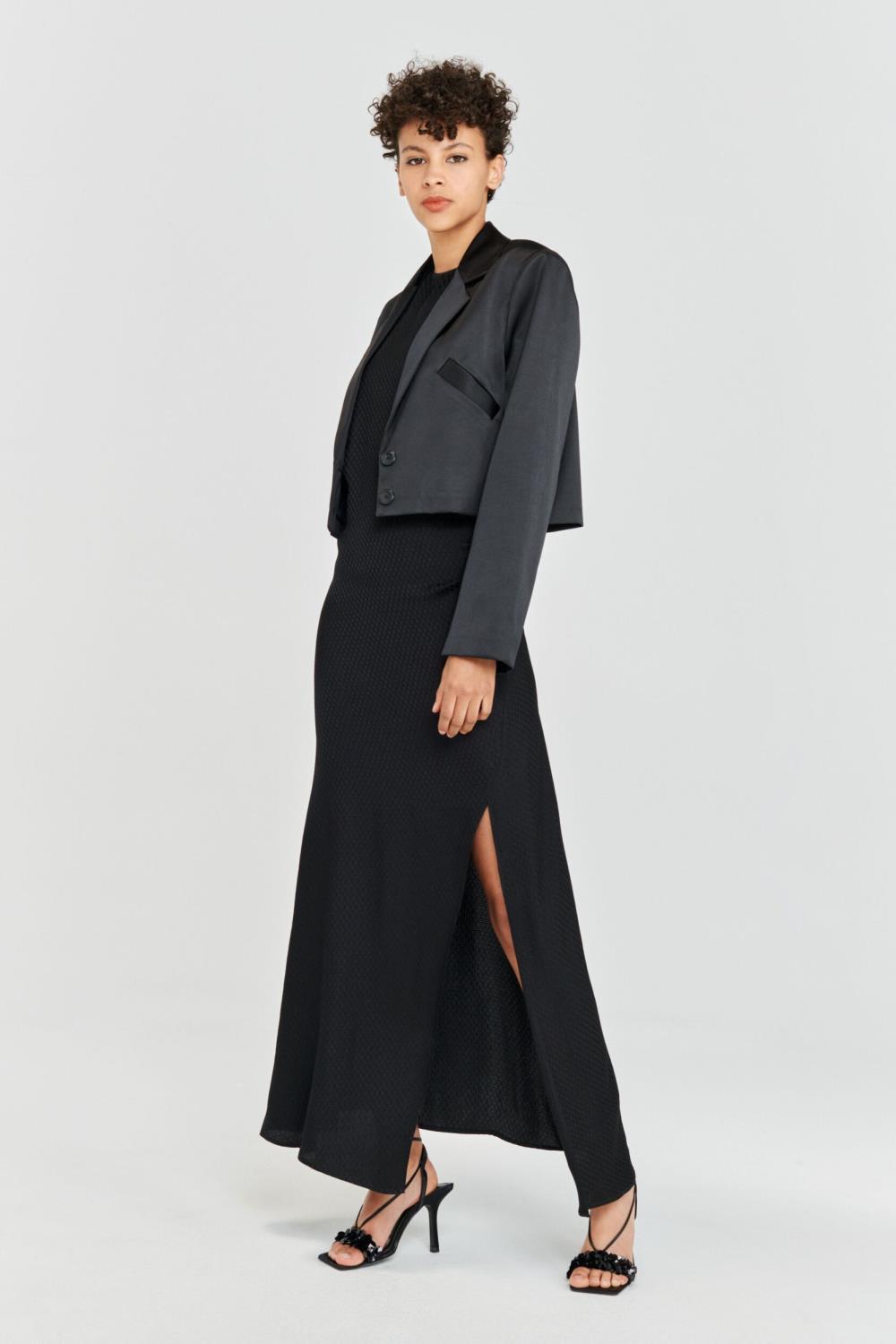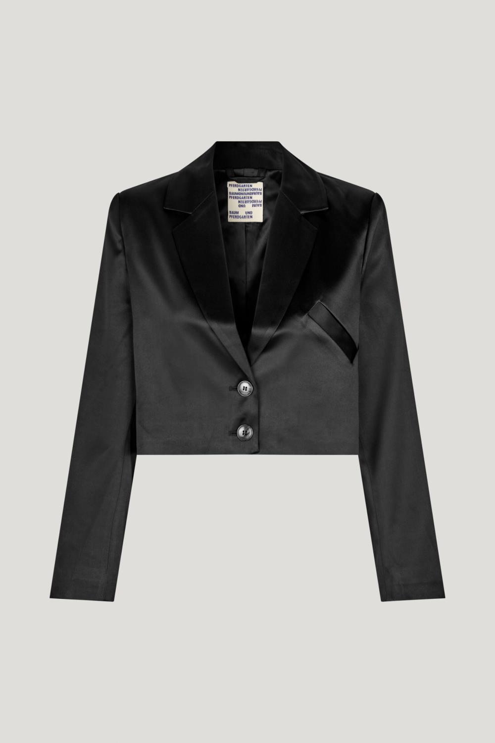 En kort smoking-inspirert blazer med jakkeslag, brystlomme og fôr.