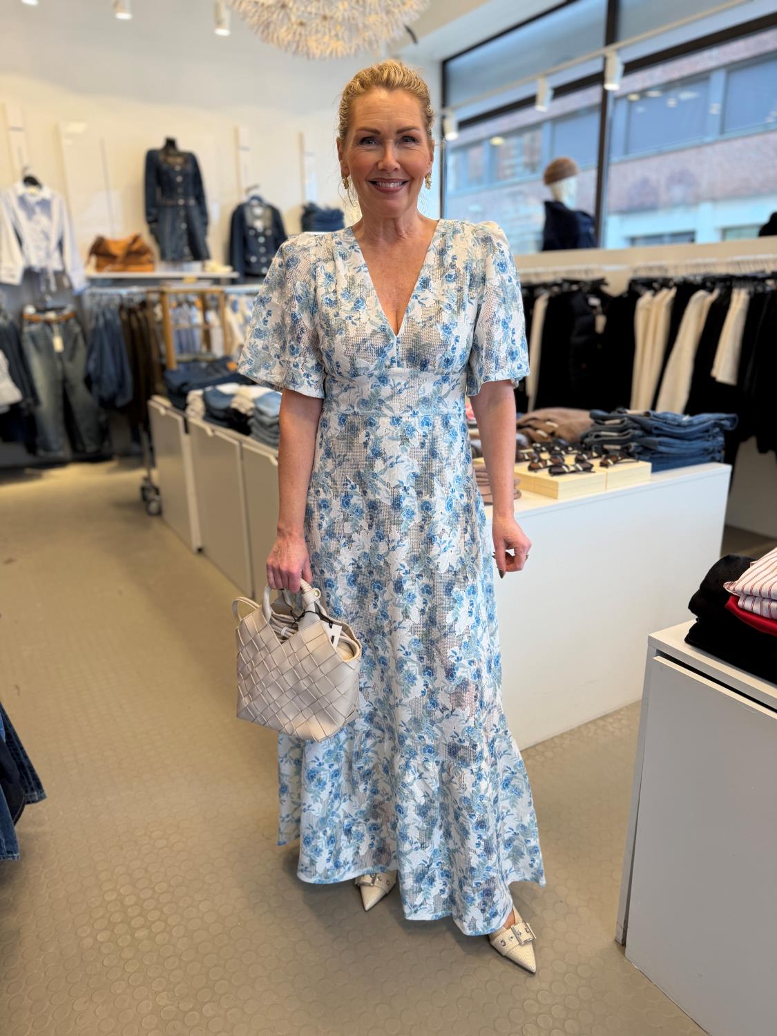 Celina Maxi Dress fra Love Lolina er en romantisk maxikjole med et mykt blått blomsterprint og flatterende V-utringning. Kjolen har korte ermer, markert midje og et langt, flytende skjørt som gir en elegant og feminin silhuett. Lett og luftig i uttrykket – perfekt for sommerdager, ferier og spesielle anledninger.