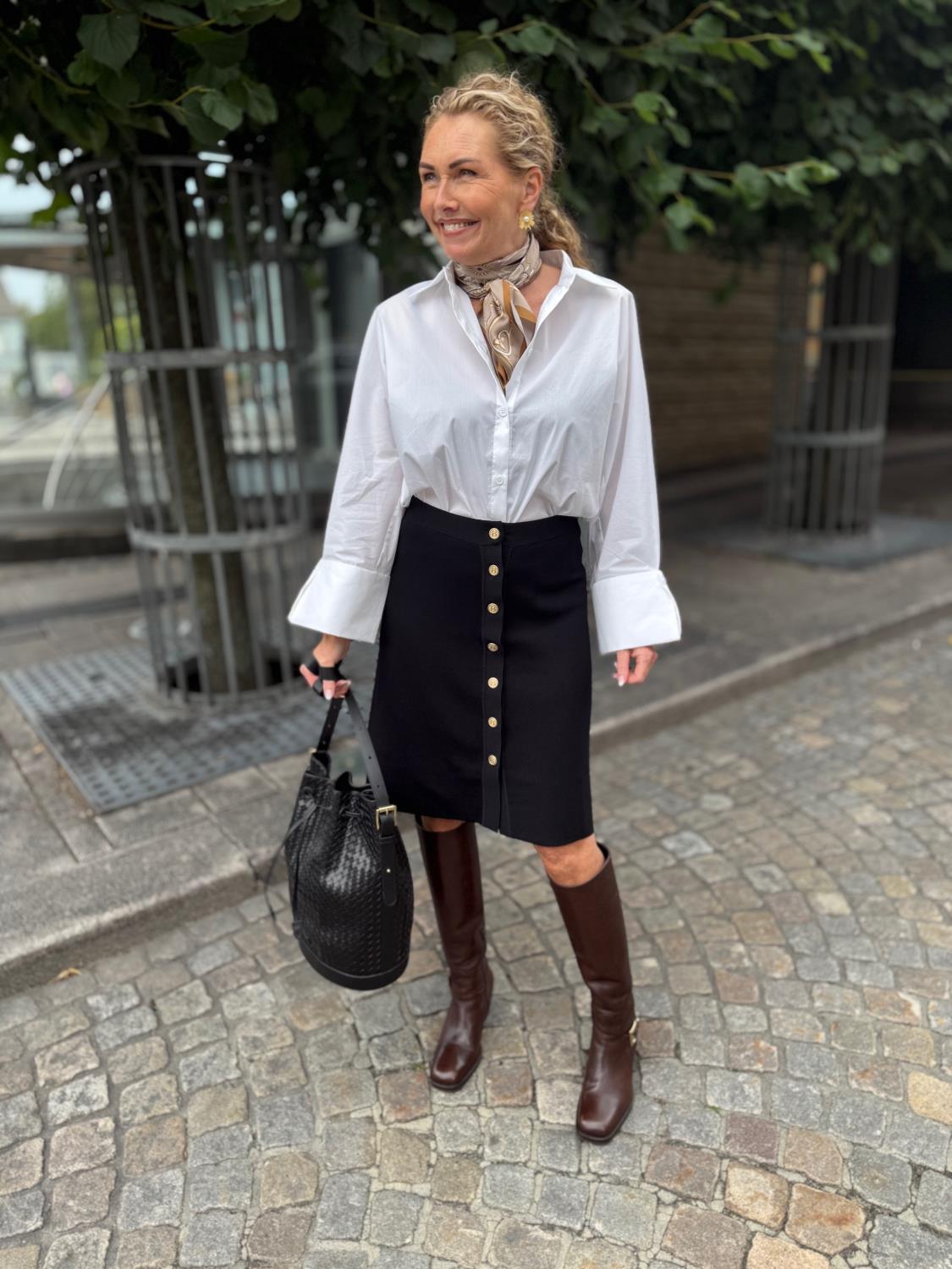 Dette skjørtet er enkelt å style – bruk det med en bluse for et profesjonelt uttrykk, eller kombiner med en strikket genser for en mer avslappet, men chic look.