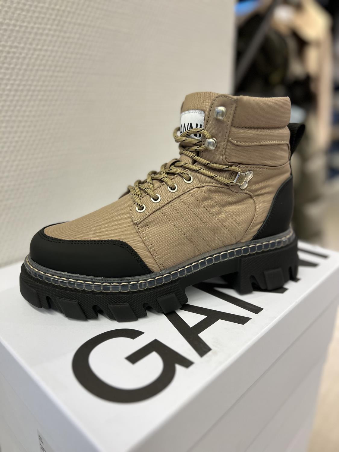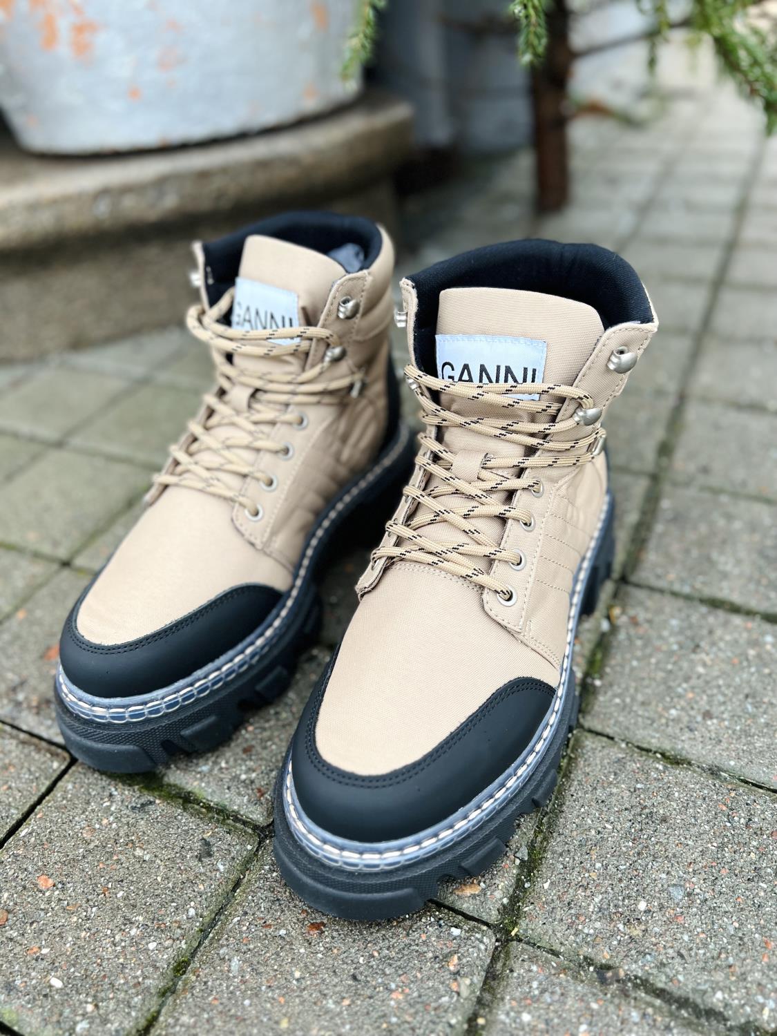 Lace Up Hiking Boots har snøring foran, rund tå, tykke såler og GANNI logo.