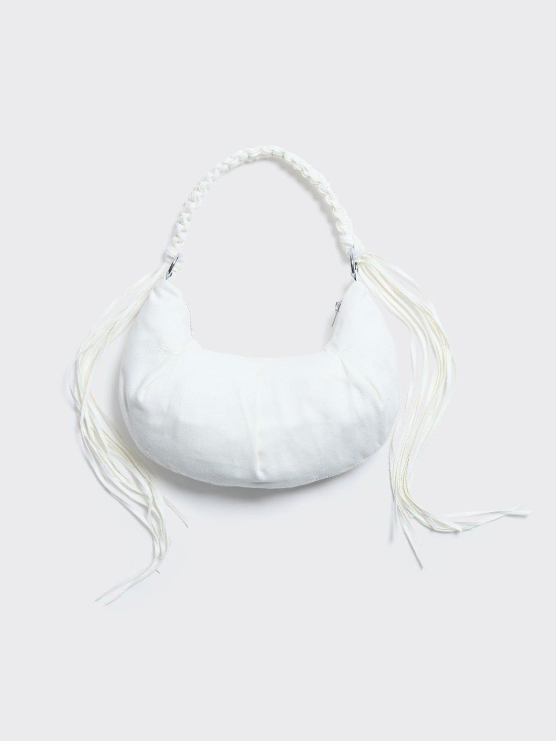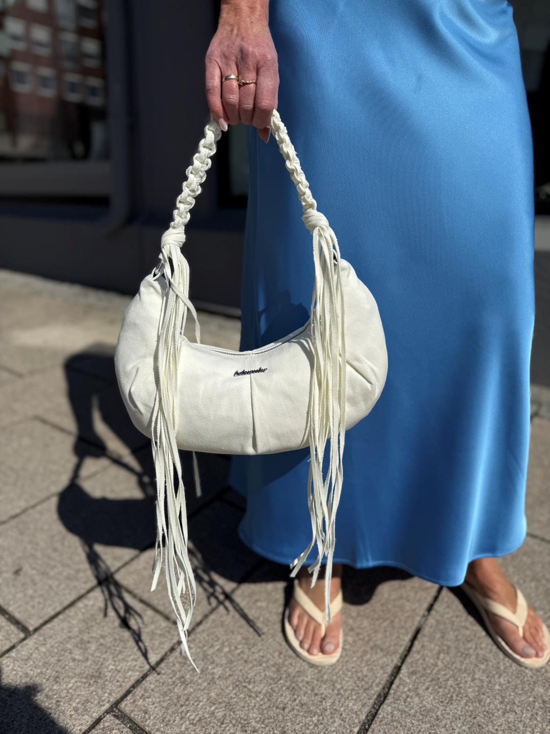 Cocoon Denim Small Bag fra Holzweiler er laget i hvit canvas, og er en ny variant av merkets bestselger. Vesken har et avslappet design med kule detaljer. Den flettede stroppen kan bæres over skulderen eller i hånden og er fullført med lange frynser.