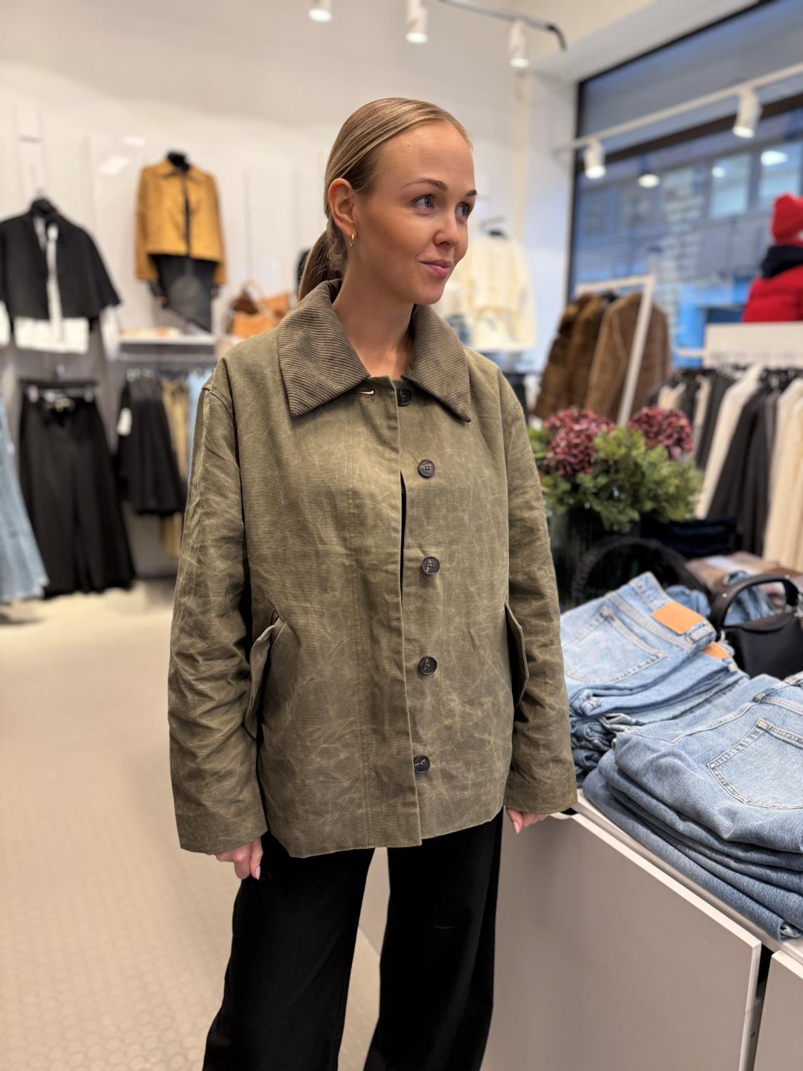 Diana Short Jacket fra Holzweiler er en stilig og moderne kort jakke i en nydelig grønnfarge, perfekt for vår og sommer. Denne jakken er laget av 100 % bomull, som gir en behagelig og pustende følelse, mens fôret i polyester- og viskoseblanding sikrer optimal komfort. Jakken har en elegant, rillet krage, vide ermer og sidelommer som tilfører både funksjonalitet og stil.