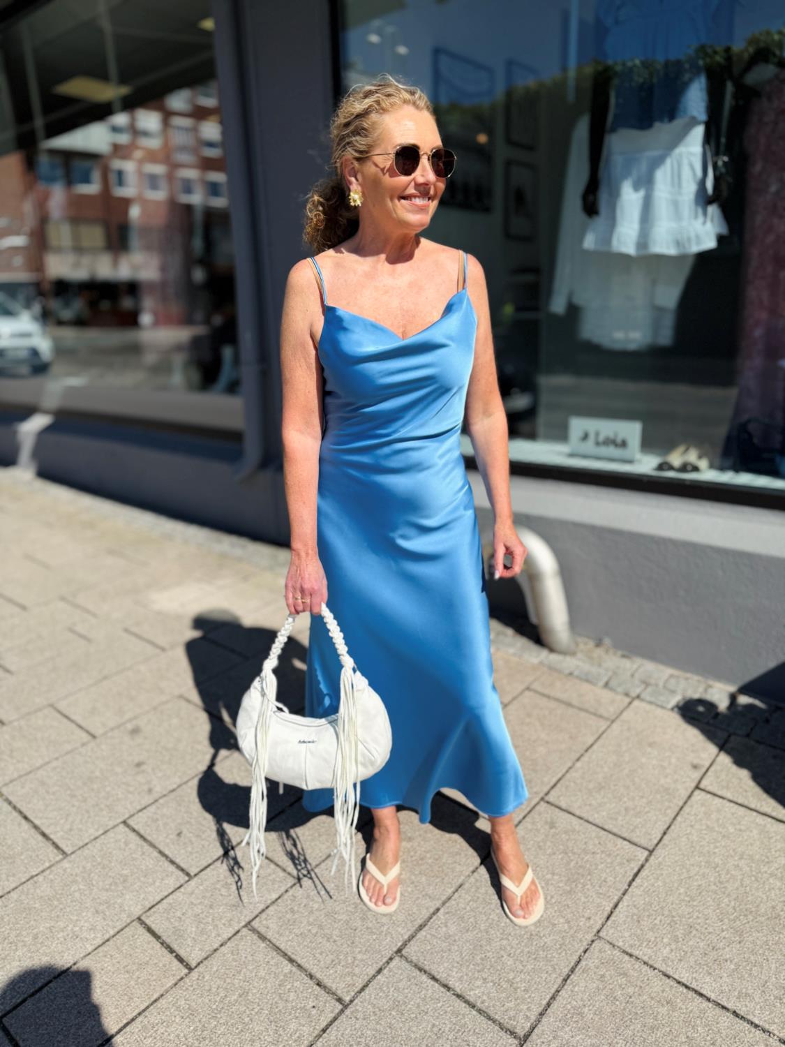 Eila dress fra Holzweiler er laget av et glansfullt satengstoff. Den henger fra tynne spaghetti-stropper og har en lett innsvinget midje.