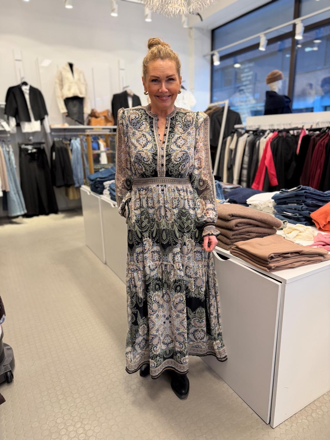 Eleanore Long Dress fra Hale Bob er en elegant og feminin maxikjole med et eksklusivt, bohemsk uttrykk. Kjolen har et vakkert mønster i dempede toner av grønt, blått og beige som gir et sofistikert og tidløst preg. Den flatterende V-halsen med dekorative detaljer og knepping skaper en feminin silhuett, mens den markerte midjen fremhever figuren på en elegant måte.