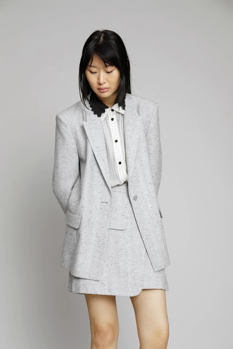 Kort og klassisk a-linjeskjørt i økologisk bomullsblanding, med asymmetrisk look og klafflomme foran. Tilgjengelig i fargen grå.