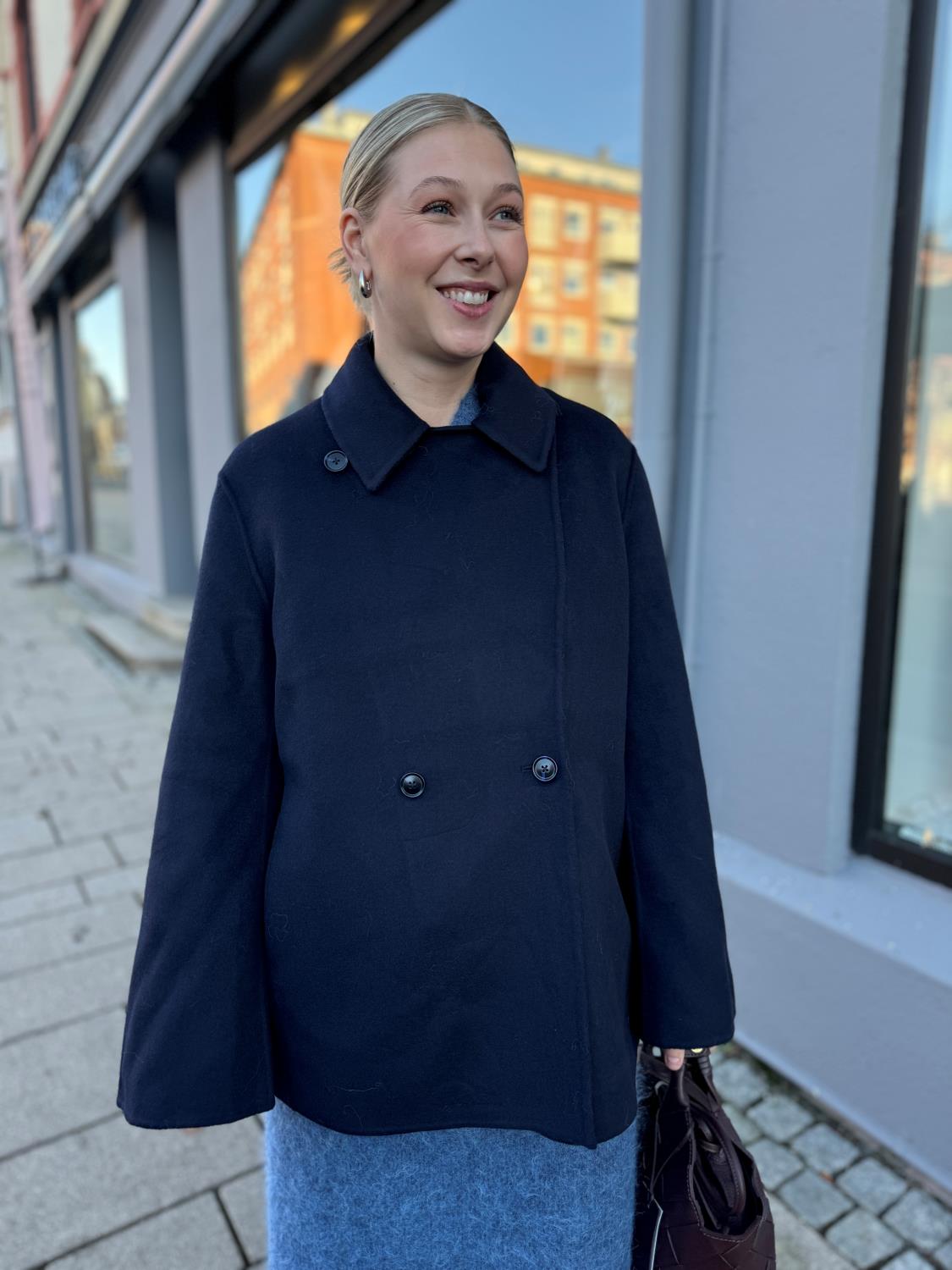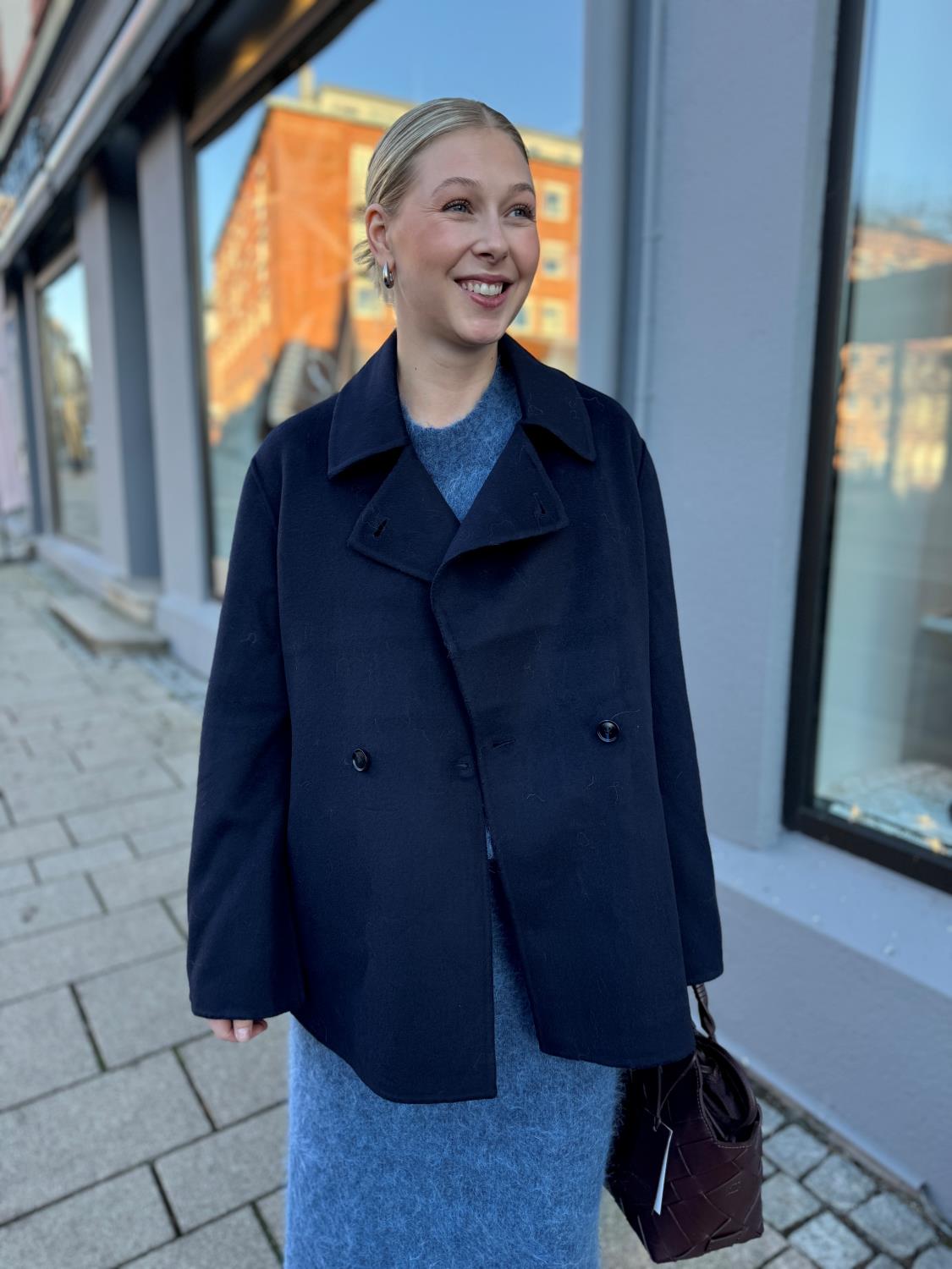 Felsa Wool Peacoat fra Holzweiler er en jakke i tovet ullblanding. Kåpen kommer en trendy bruntone og i tillegg holder deg god og varm da det er mye ull i den. Den har brede jakkeslag, lommer i sidene og lukkes med knapper i front. Rett og avslappet passform med fin lengde.