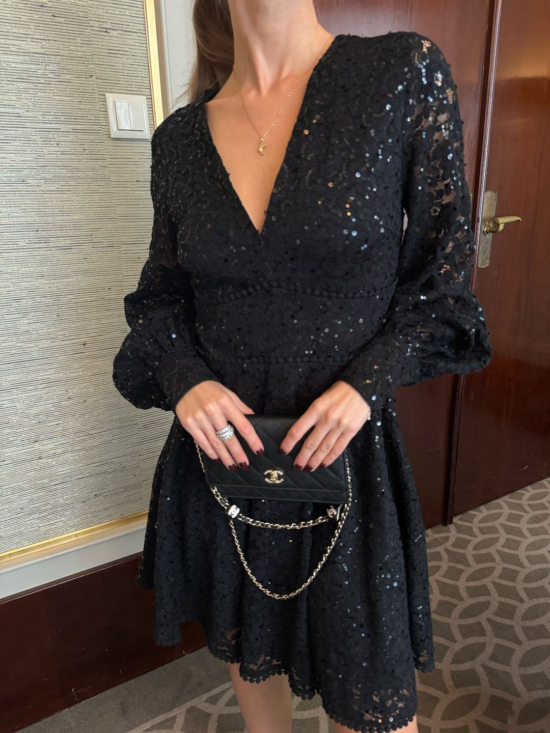 Freya mini dress fra Love Lolina er en svart blonde-minikjole med V-utringning, lange ermer og en lett innsvinget midje. Subtile paljetter tilfører et hint av glamour, perfekt for fester og kveldsanledninger.