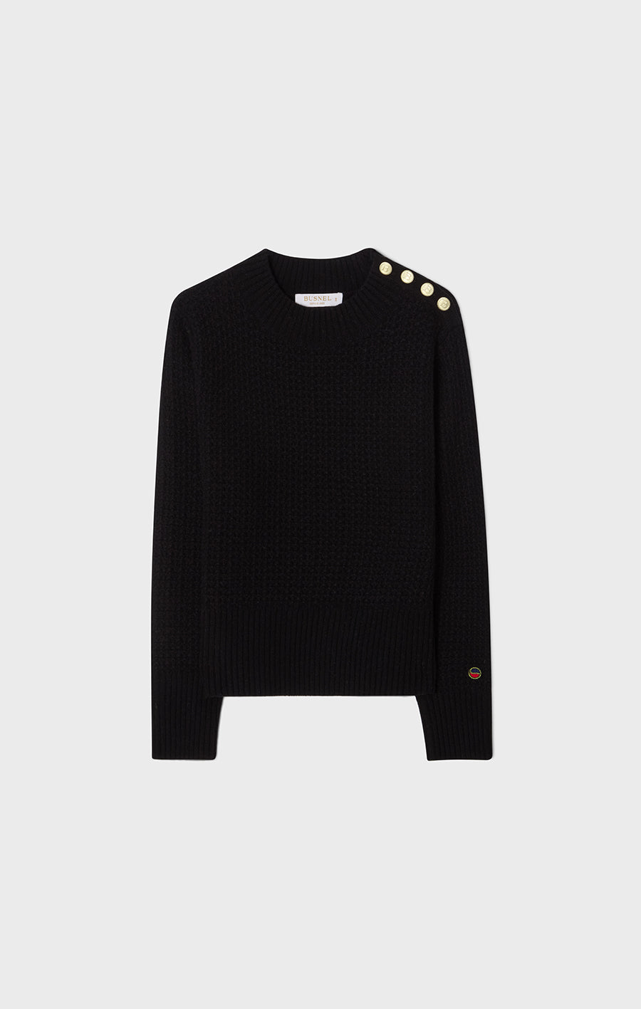 Garmia Sweater er strikket av en ullblanding med en strikketeknikk som skaper en struktur og subtilt mønster. Passformen er vanlig med rund hals, vrangborden nederst gjør at den sitter fint på hoften og er detaljert med gylne B-knapper på venstre skulder. Mtach genseren med Gail skjørt fra Busenel for en koplett look.