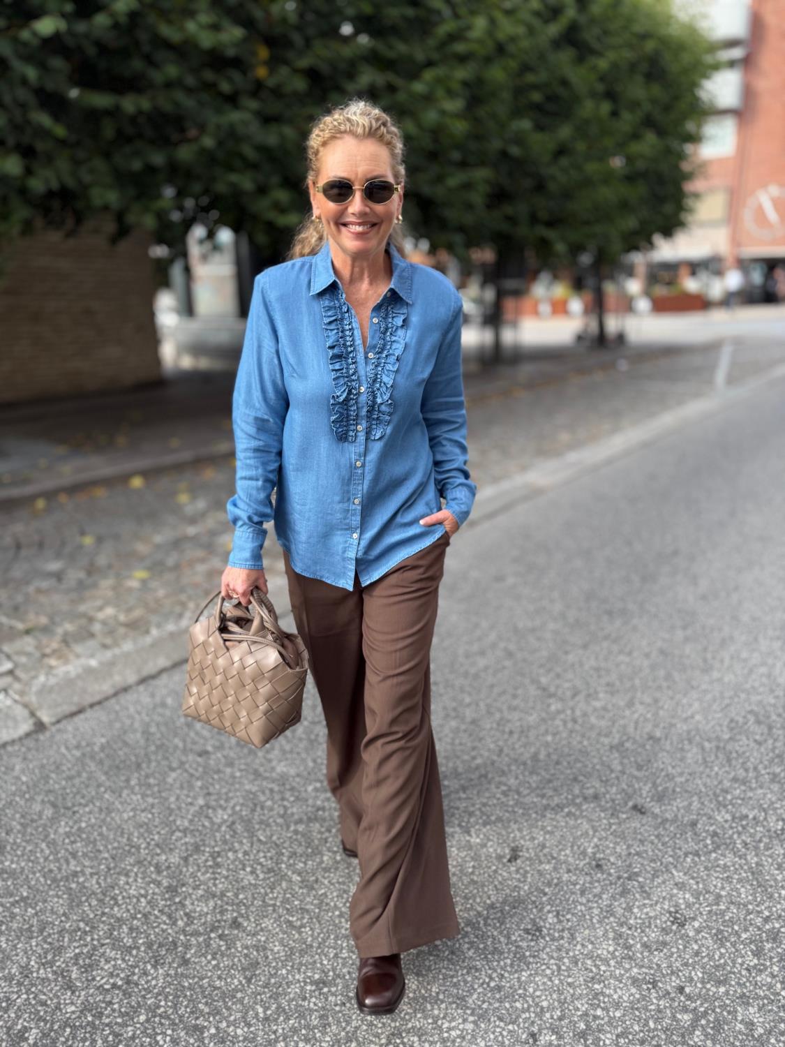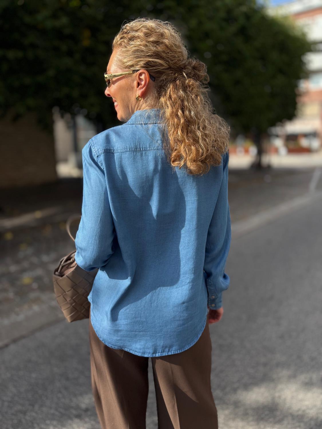 Gina Tencel Blouse fra Alma er en bluse i nydelig lyocell kvalitet. Blusen har en krage, knappelukking hele veien, lange armer med delikate masjetter og rysjer forran.