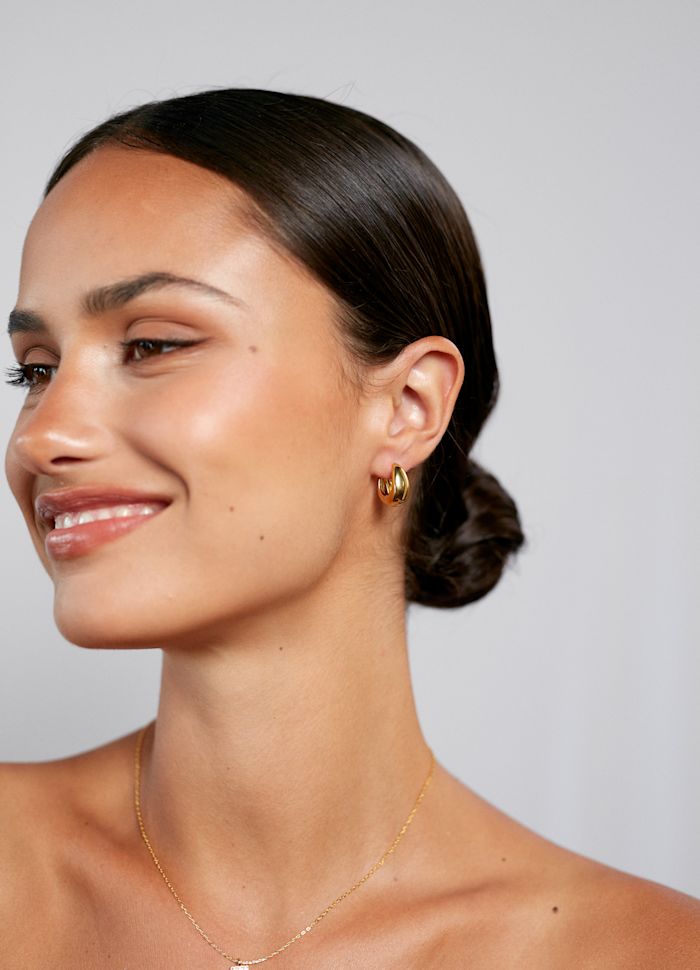 Golden Curve Hoops Petit fra ANNI LU er delikate, skulpturelle øredobber i varm gulltone. De små, men fyldige hoopene har glatte, polerte kurver som reflekterer lyset og gir en varm gullglød. Den organiske formen sitter komfortabelt ved øret og passer både til hverdag og fest. Bruk dem alene for et rent uttrykk, eller kombiner med flere for et lagdelt look. Laget i messing med 18 karat gullbelegg og beskyttende anti-tarnish e-coating for varig glans.