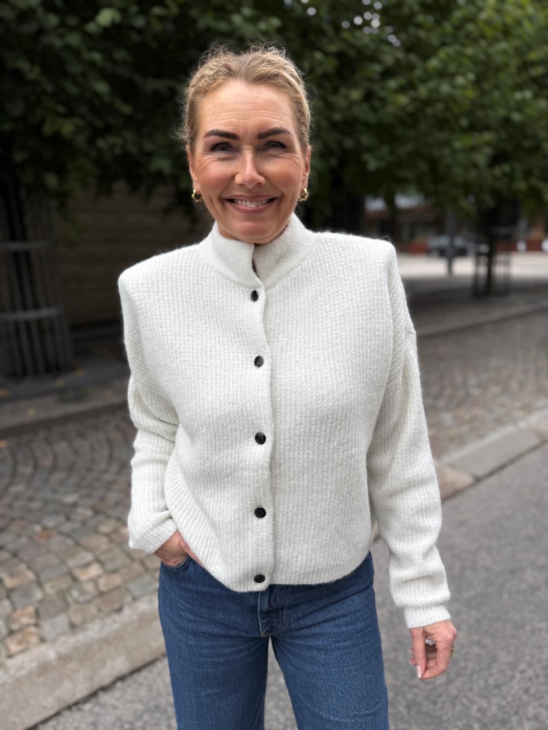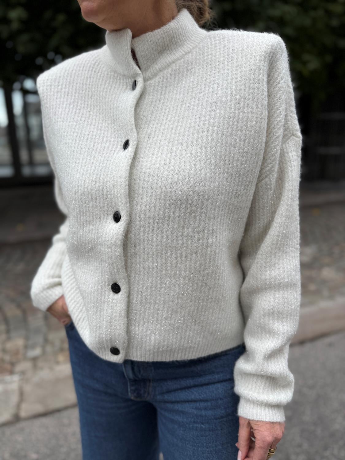 Cardiganen har en rett passform med senkede skuldre og ribbestrikket kant som gir et avslappet, men stilig uttrykk. De sølvfargede knappene i front gir en eksklusiv touch og gjør det enkelt å style plagget åpent eller lukket.