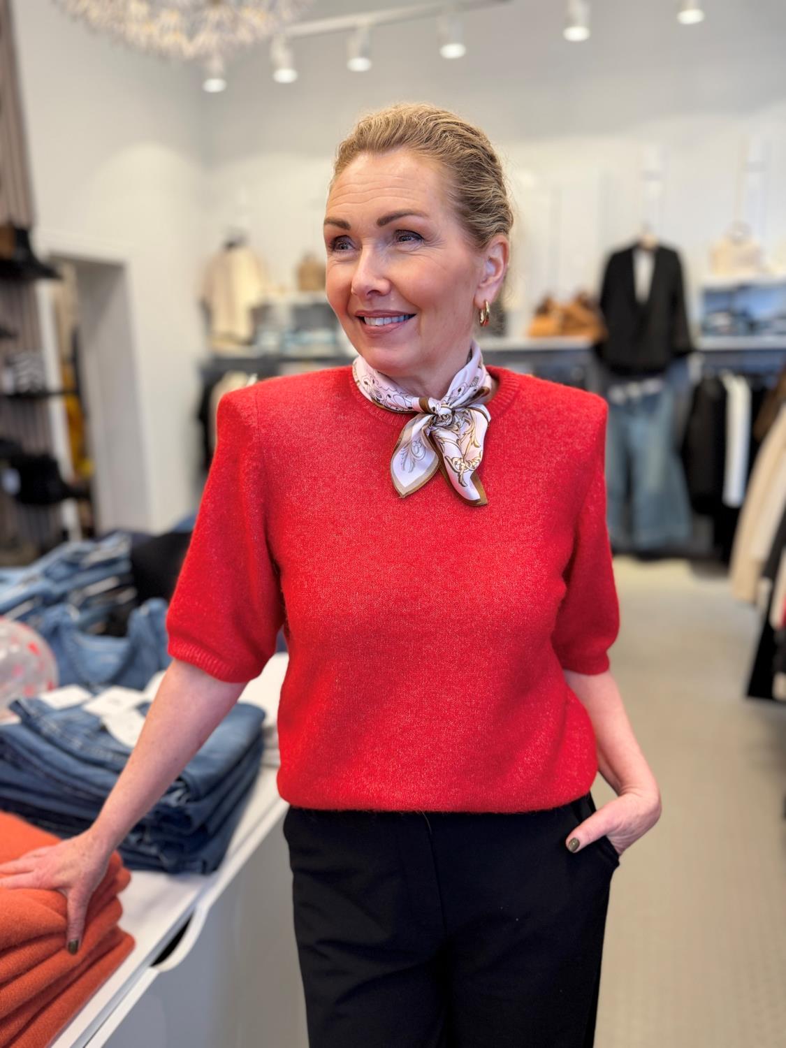 En deilig strikkegenser i en nydelig rødfarge. Modellen har rund hals og trekvart lange ermer, samt en rett passform,