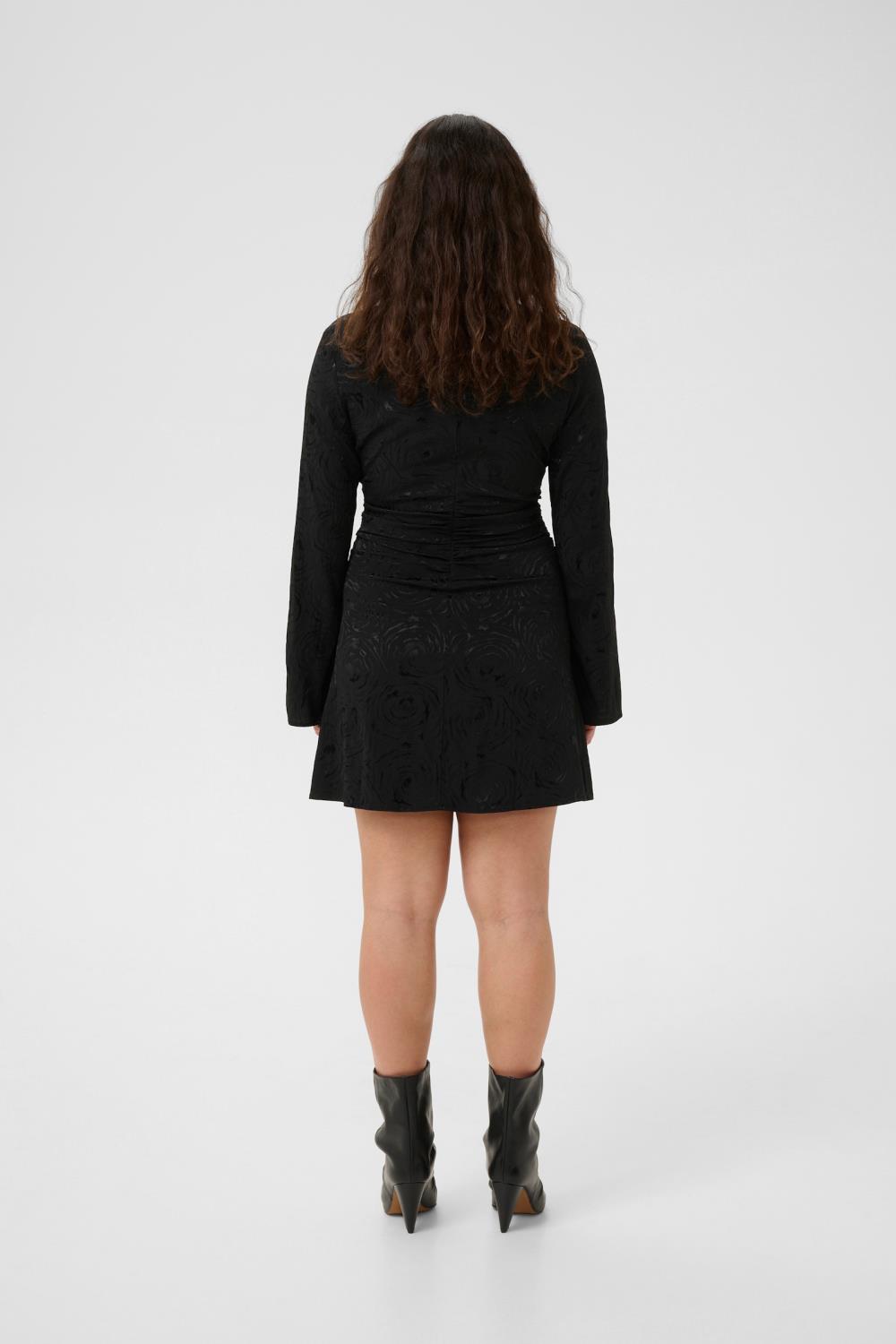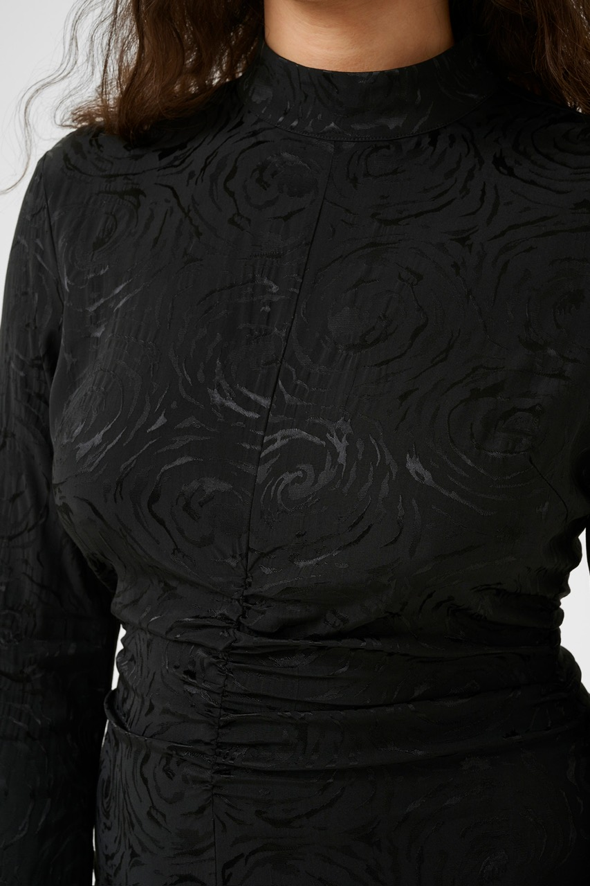Gzrosia Short Dress fra Gestuz er en elegant og moderne minikjole i svart med rosemønster. Kjolen har lange ermer, høy hals og smal midje med lett drapering som fremhever silhuetten. A-formet skjørt og fløyelens glans gir et eksklusivt uttrykk – perfekt til festsesongen.