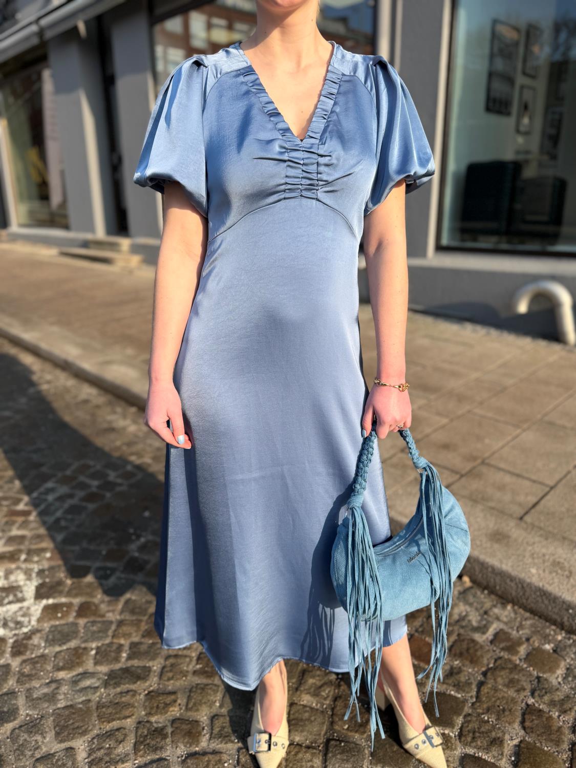 Illana Heavy Sateen Dress fra Neo Noir er en fin maxikjole i et mykt, tungt satengstoff som faller fint nedover kroppen. Kjolen har en vakker v-hals foran og noen pufferm.