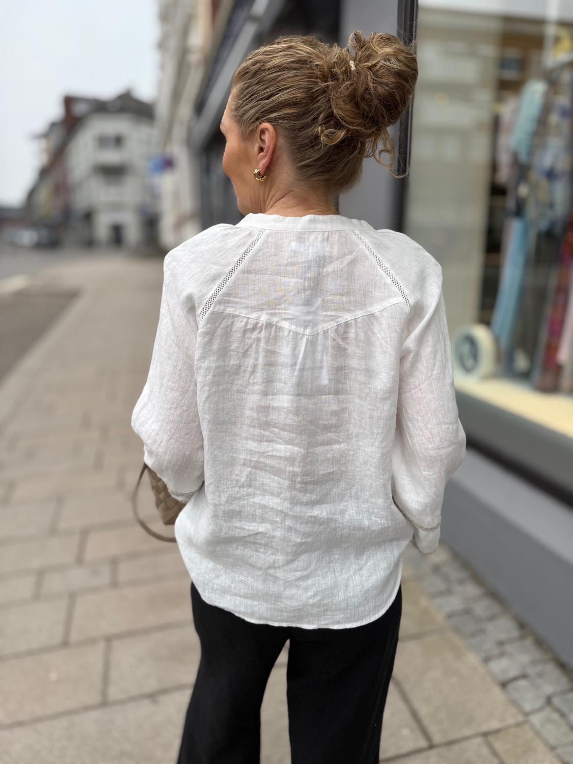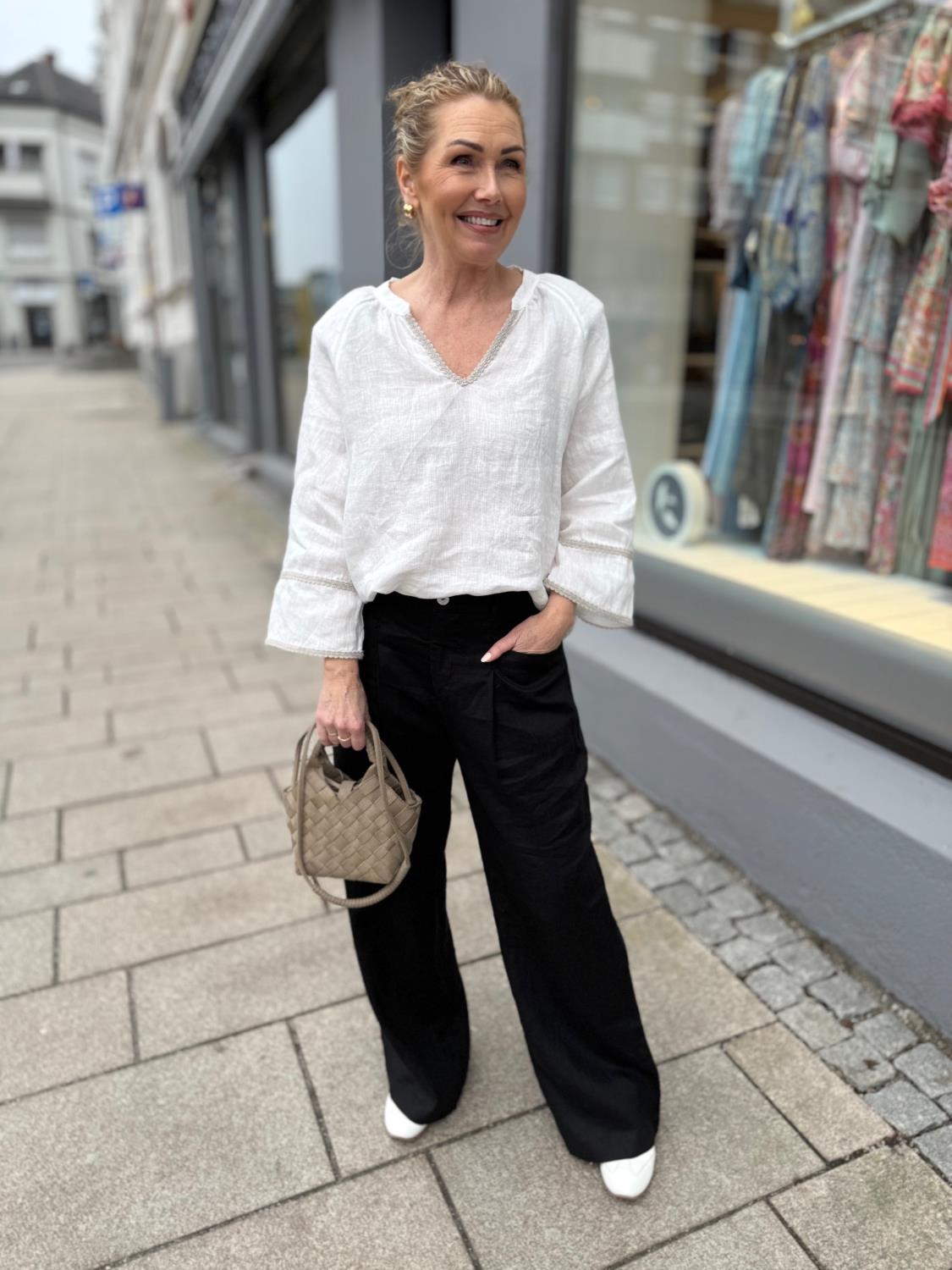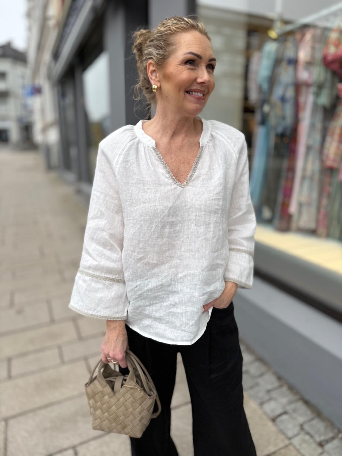 Ina Linen Tunic fra Alma er laget i en fin linkvalitet. Blusen er rett i fasongen, v hals, nydelige detaljer og vide ermer.