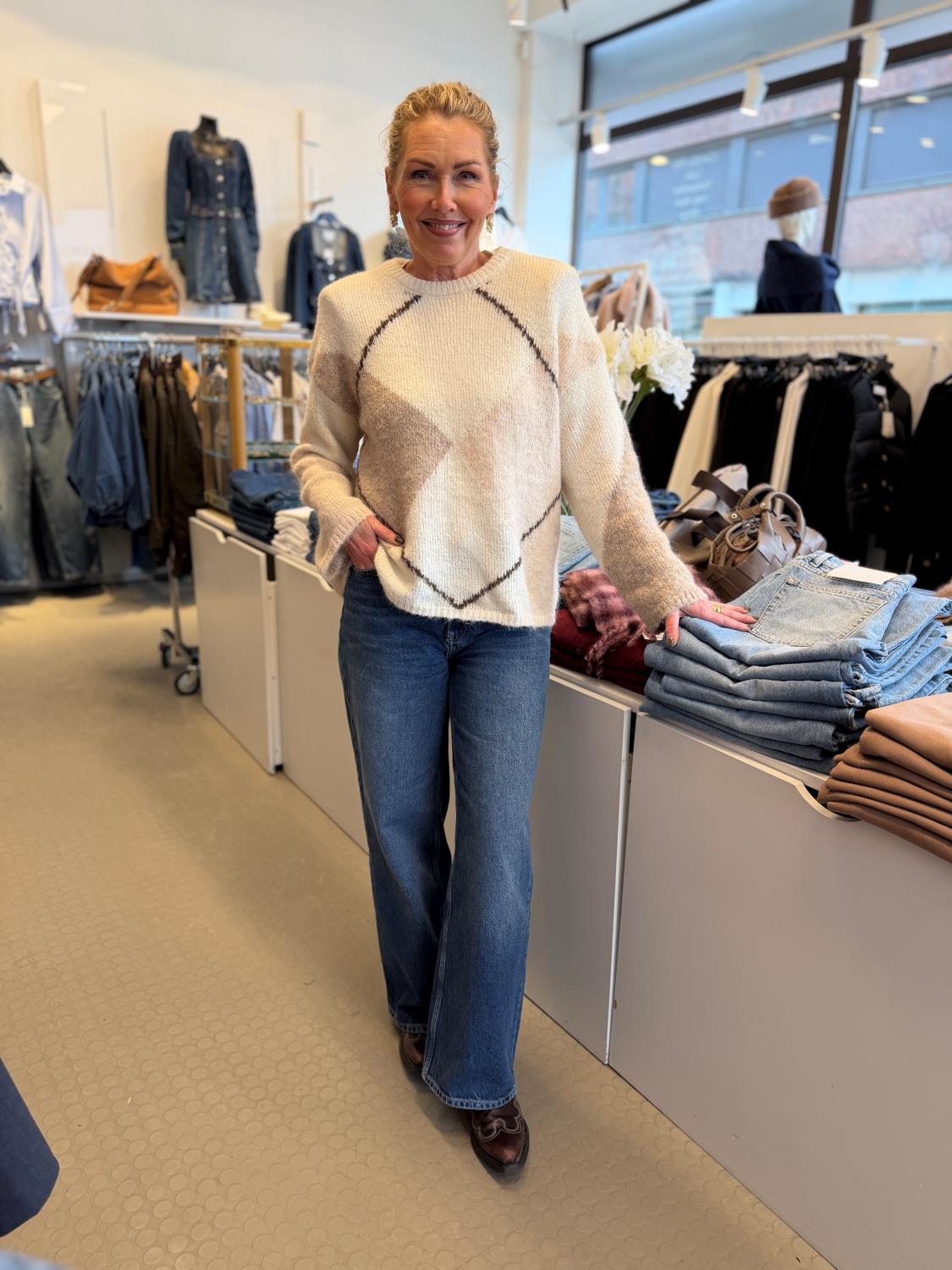 Inga Check Fluff Knit Blouse fra Neo Noir er en kul oversized strikket genser i et fint argyle-mønster. Kvaliteten har en behagelig fluffy følelse og utseende, og modellen er 176 cm høy og bruker størrelse 36.
