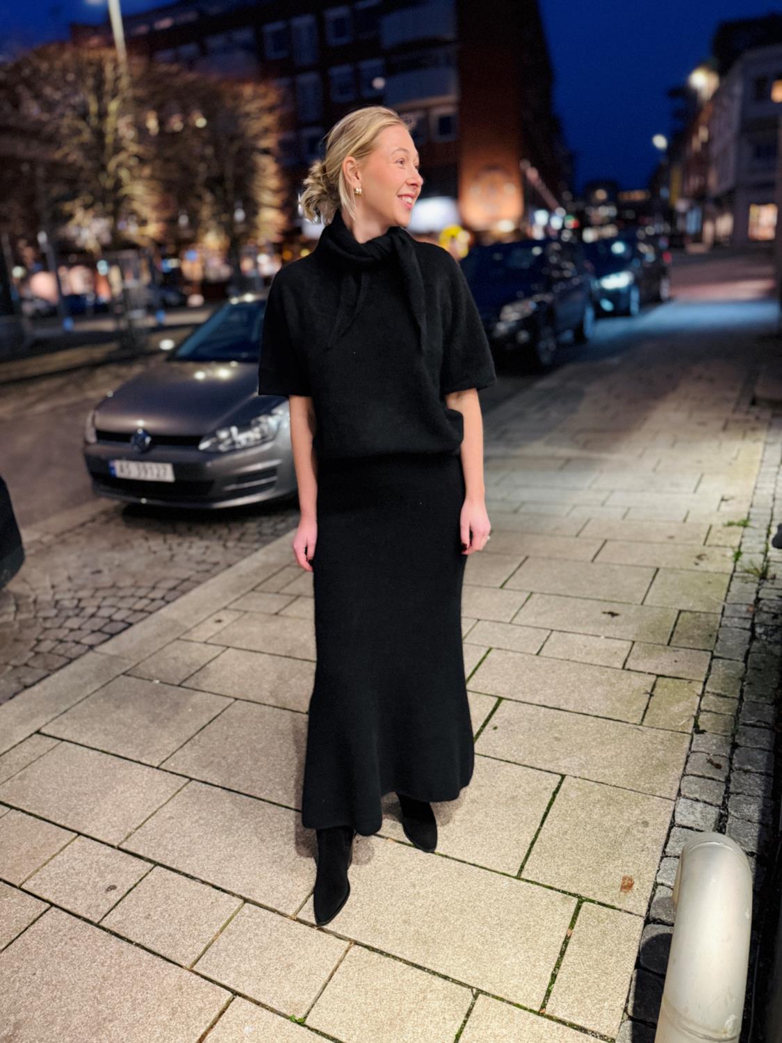 Isabella maxiskjørt fra Six Ames. Den har ribbestrikk i midjen med strikk på innsiden, og en delikat finish nederst.