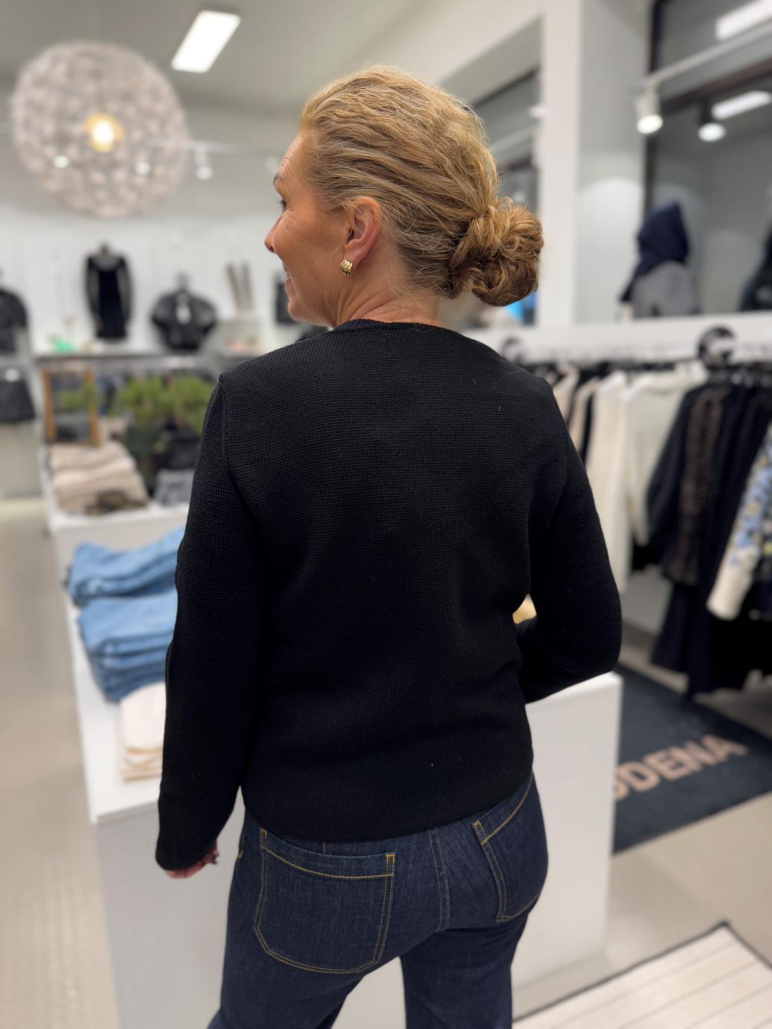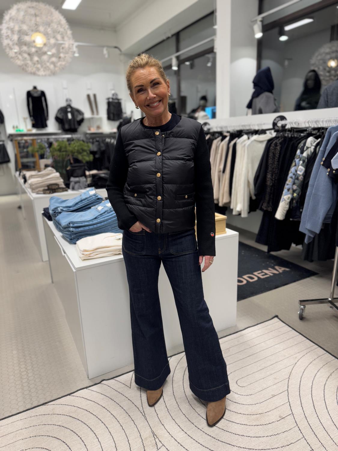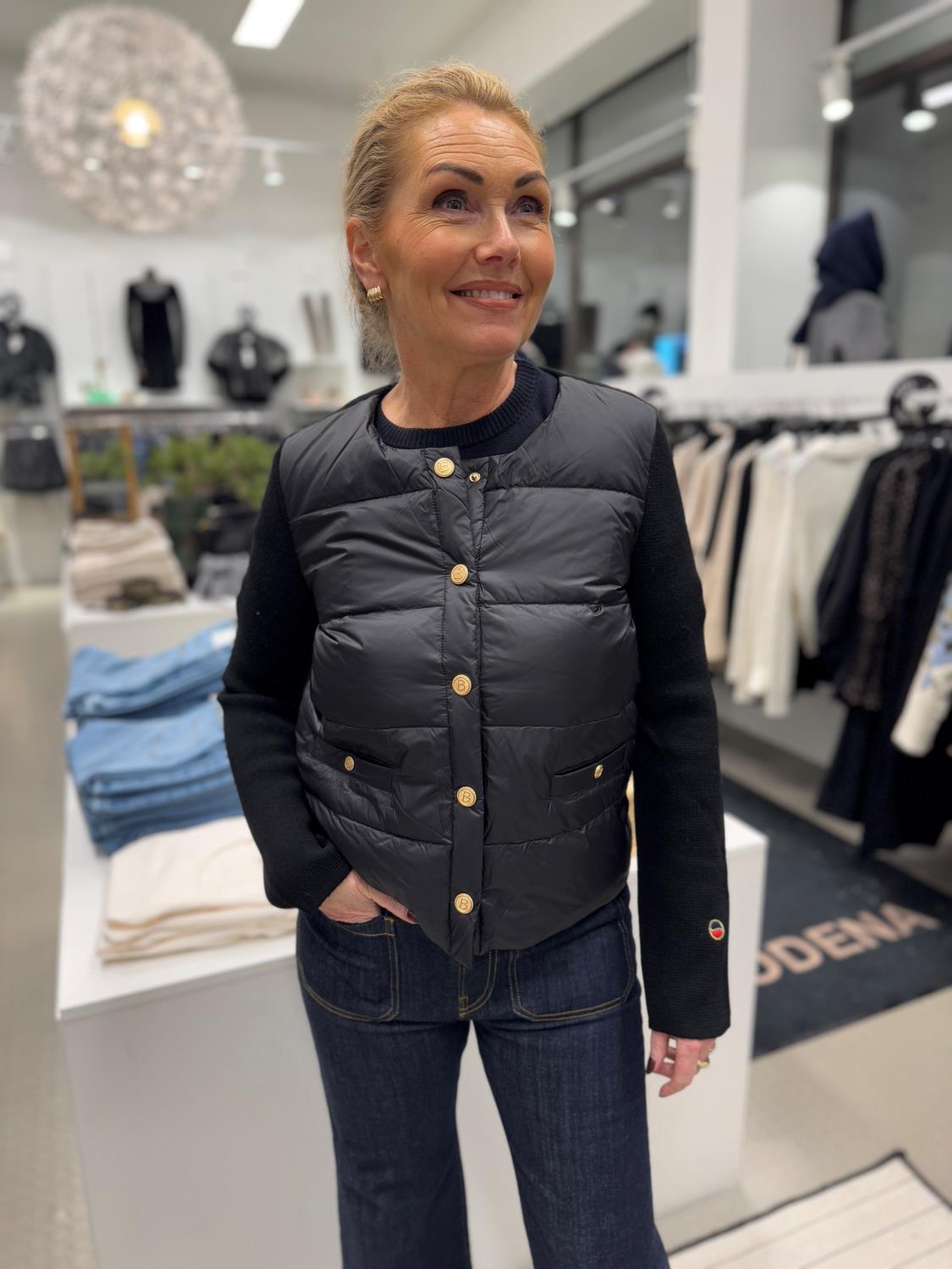 En lekker, feminin jakke med dun foran og ull bak. Signaturknappene til Busnel foran.