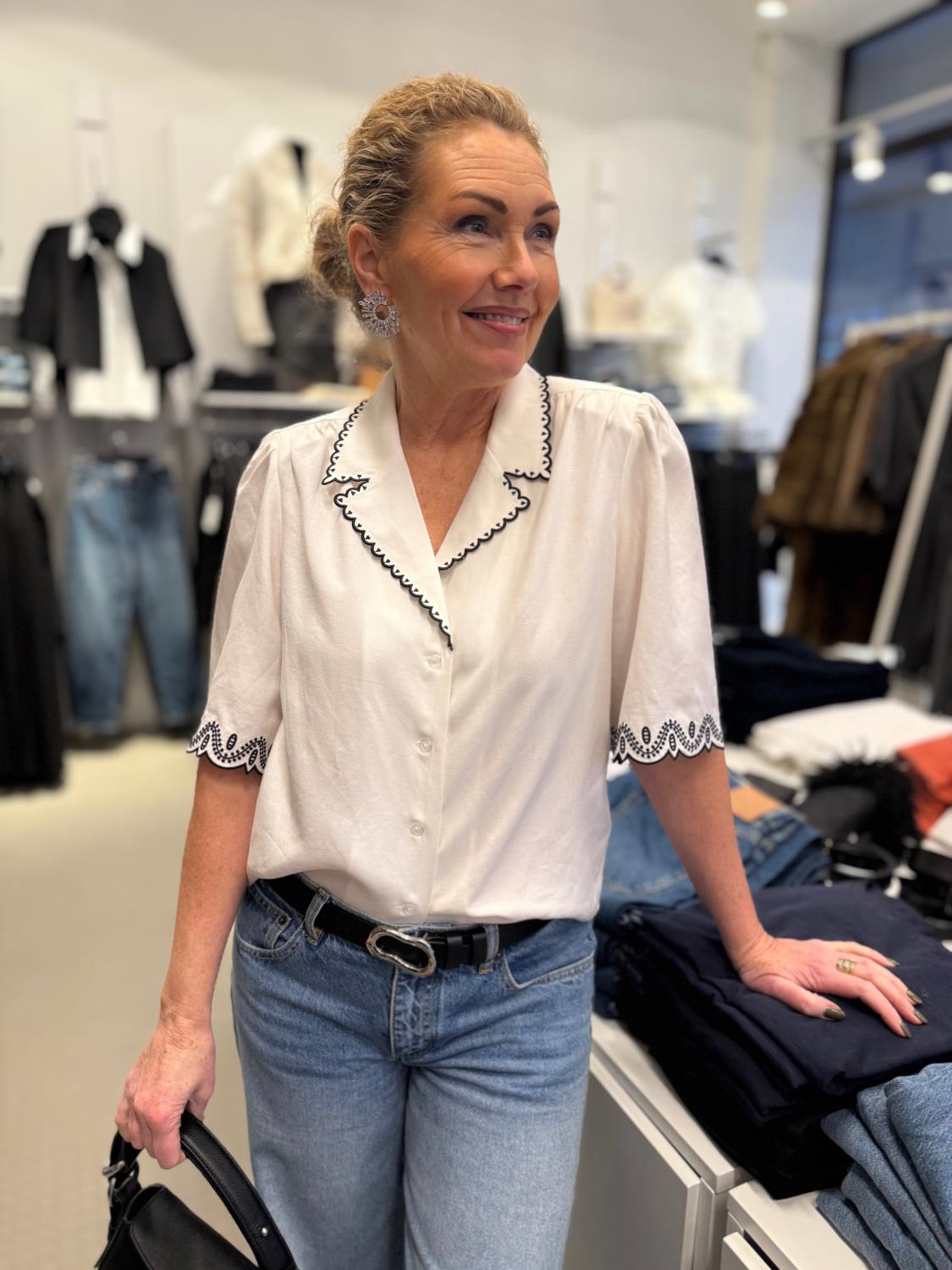 Jane Blouse er en tidløs og elegant bluse laget i en lett og behagelig blanding av TENCEL™ og lin. De delikate broderidetaljene langs kragen og ermeåpningene gir et eksklusivt preg, mens den avslappede passformen gjør den like komfortabel som den er flatterende. Med knappestol i front og bærestykke bak får blusen et mykt fall og naturlig volum – perfekt både til hverdags og mer pyntede anledninger.