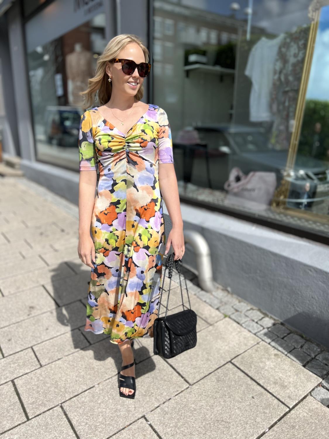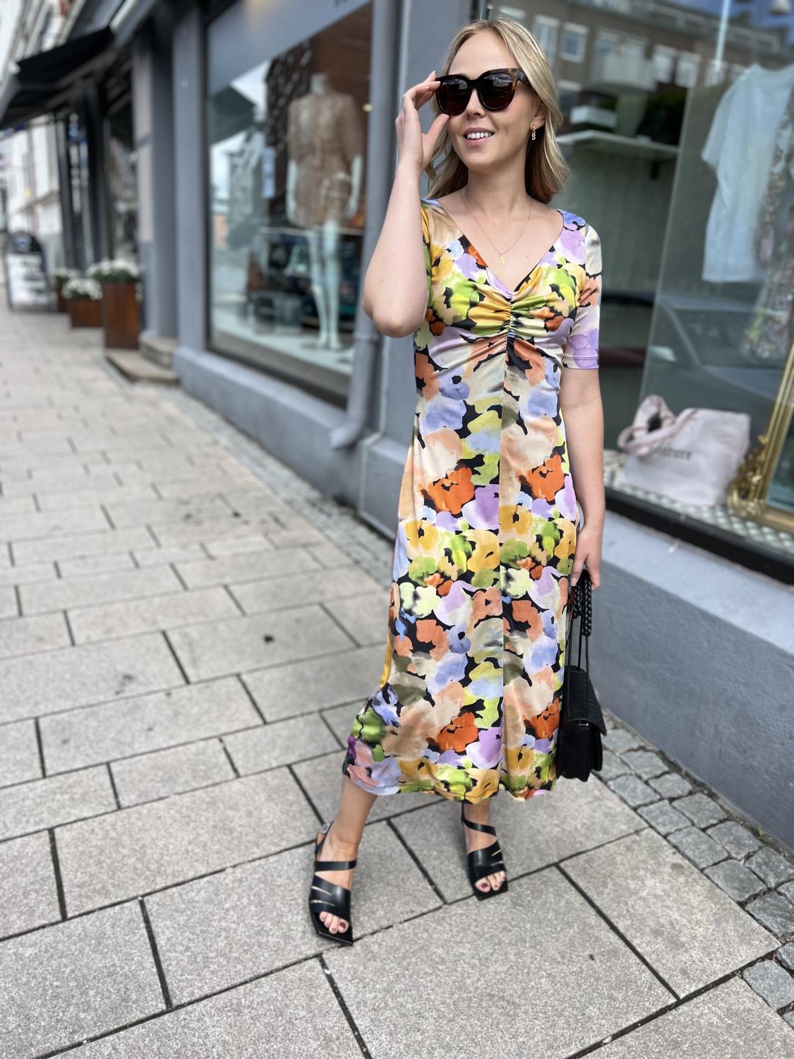 Midi A-linje kjole med korte ermer og abstrakt blomstermønster. Smigrende ruching-detalj foran og bak.