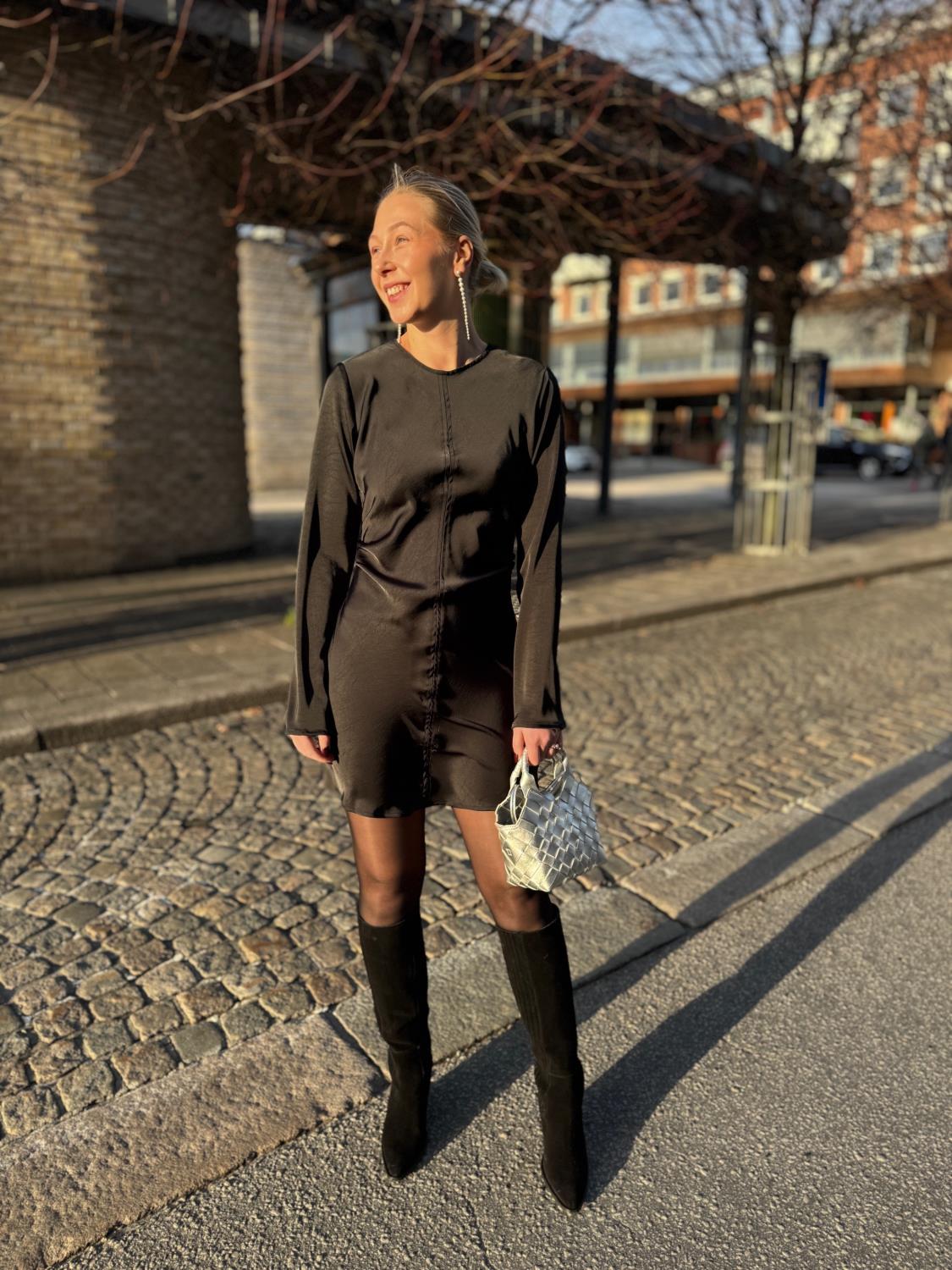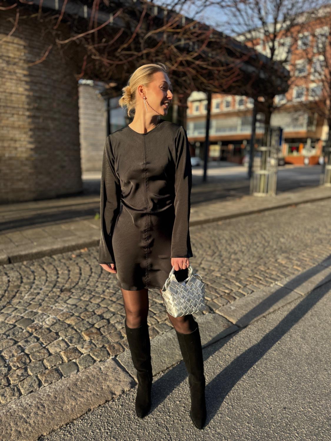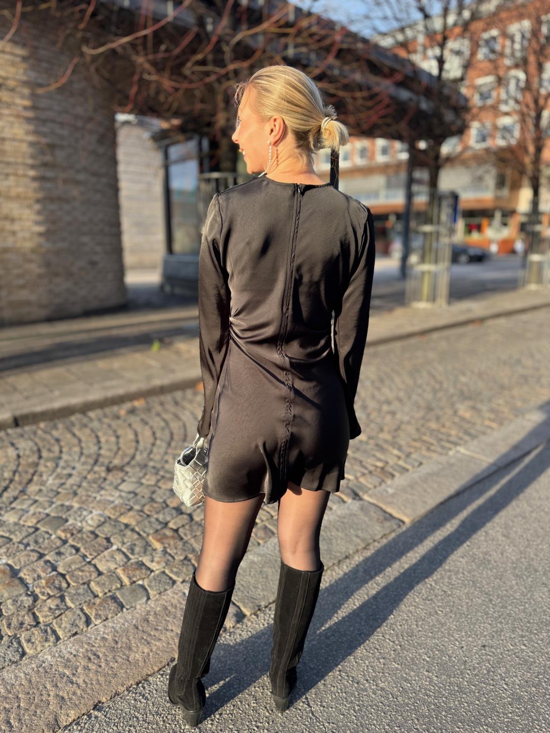 Jumari Heavy Sateen Dress fra Neo Noir er en kort, tettsittende kjole med lange ermer. Ermerne er vide nederst. Kjolen har glidelås bak og kommer i en vakker, tykk satengkvalitet. Modellen er 170 cm og bruker størrelse 36.