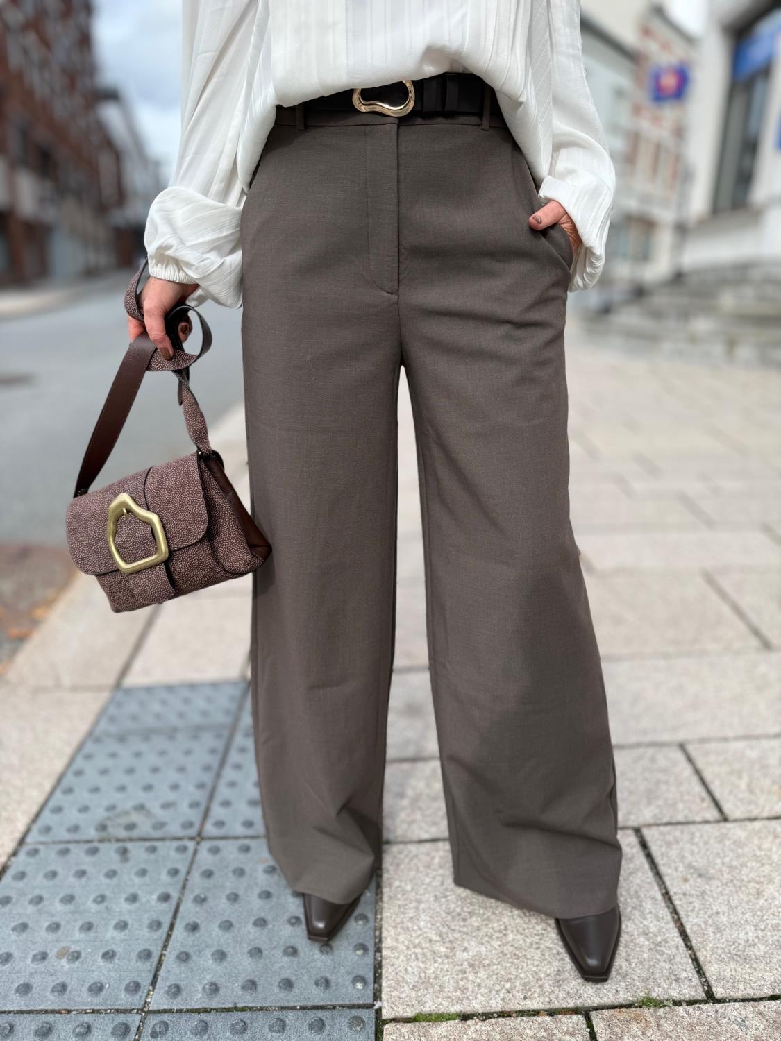LauraFV fra Five Units er elegante bukser i full lengde, skåret i en ren og klassisk silhuett. De er designet med høy midje og vide ben som skaper et sofistikert uttrykk. Buksen er perfekt både med flate sko og høye hæler. Buksen lukkes med knapper og har paspolerte lommer som gir en skarp og skreddersydd finish.