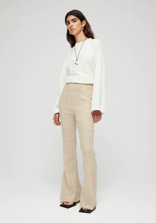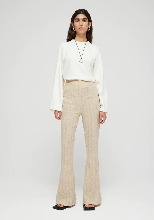 Bukser med rette ben i lin-dråpe-nålstoff fra den italienske fabrikken Bartolinni. Høyt liv. Modellen har på seg størrelse 36 og er 177 cm høy. Materialet er 63% lin 37% bomull.