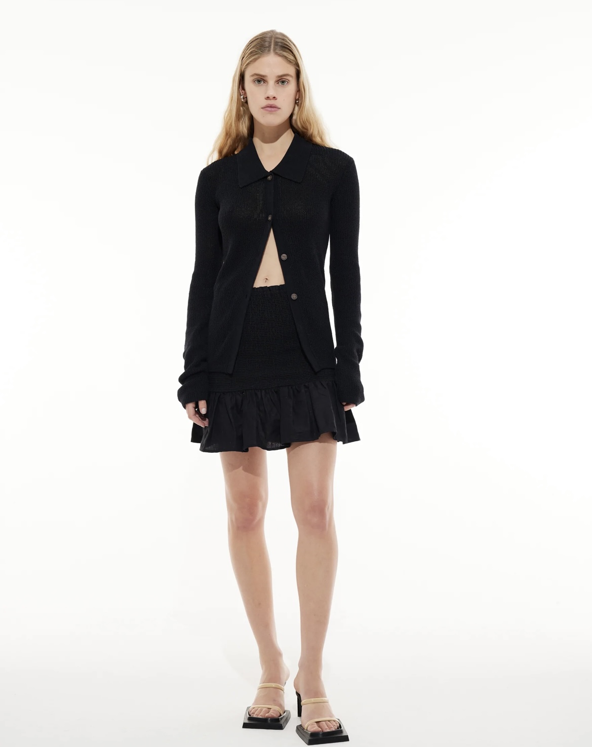 Smockskjørt med volang nederst. Laget i en linblandingskvalitet. Modellen har på seg størrelse S og er 172 cm høy. Materialet er 56% lin og 44% bomull.