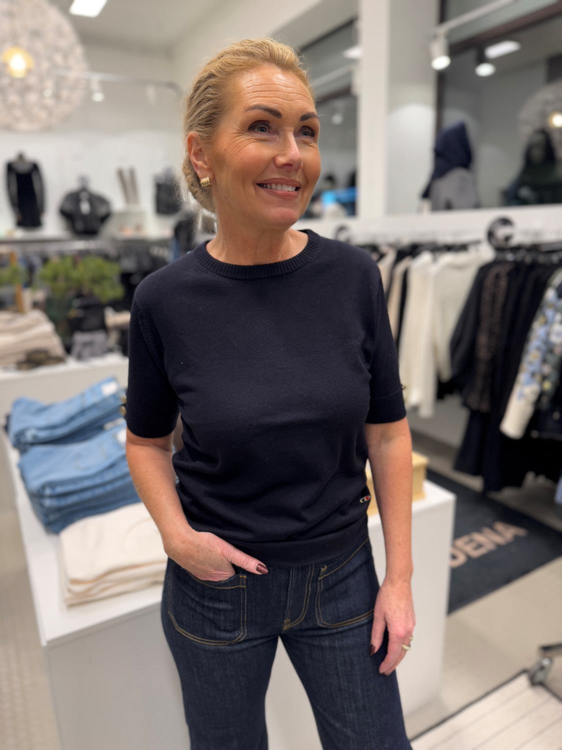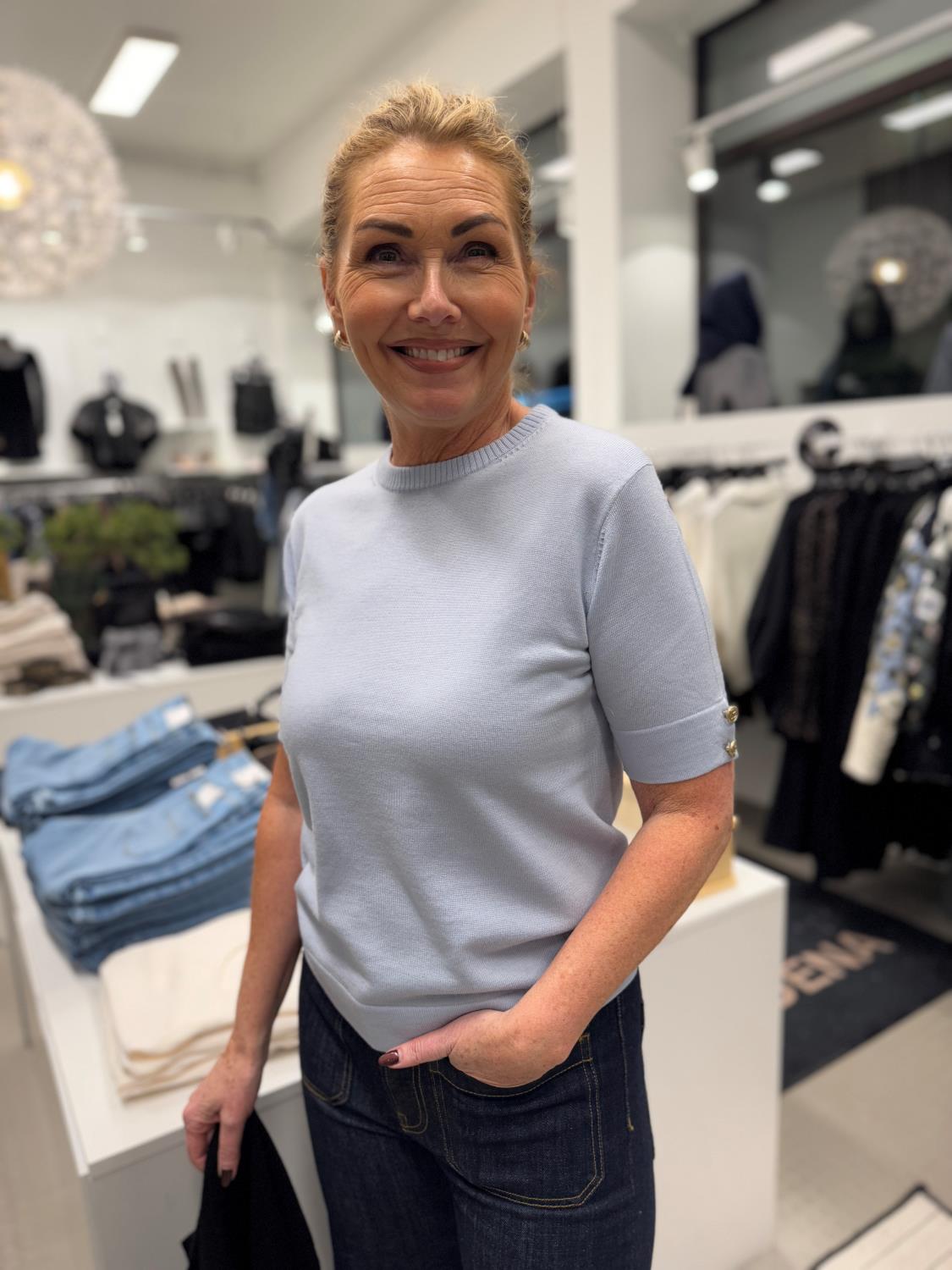En feminin t-skjorte i merinoull med lekre signaturknapper på armene.