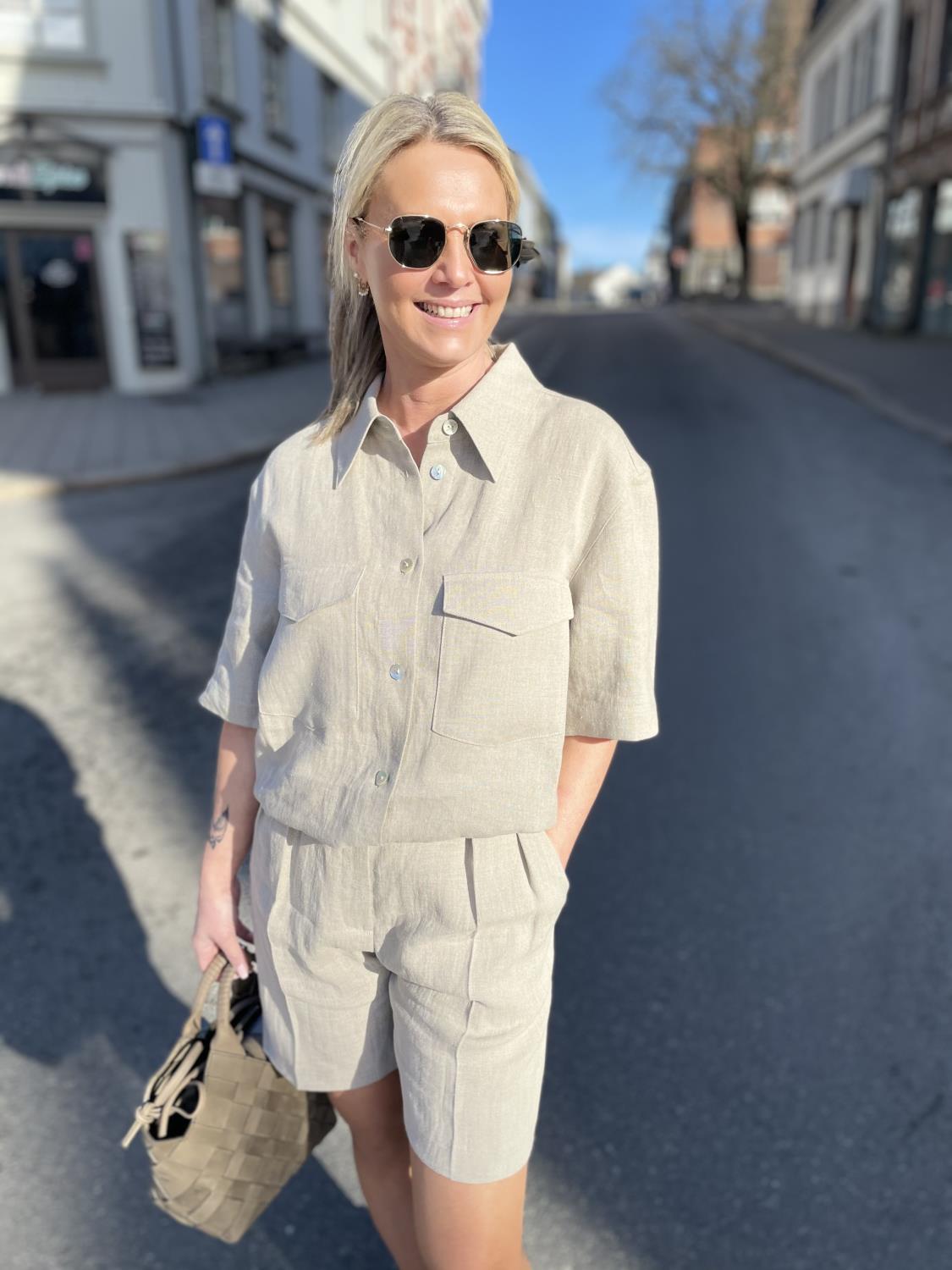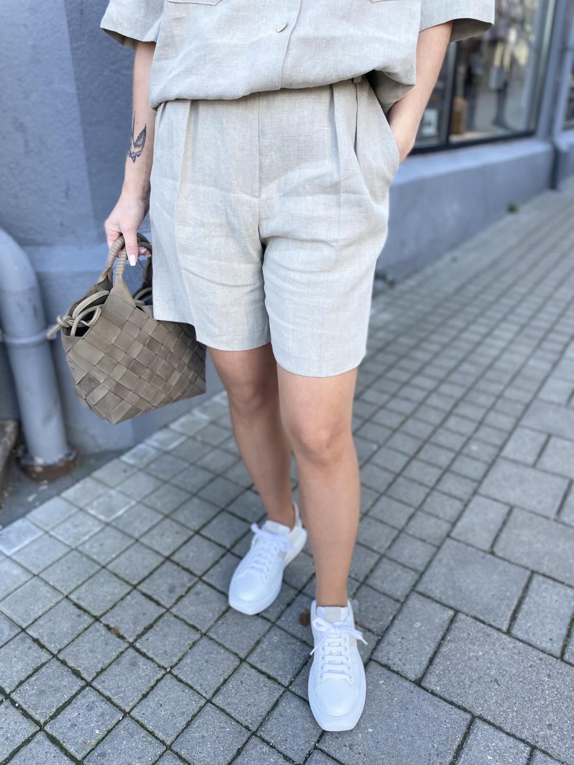 Skreddersydde shorts laget av et vakkert linstoff fra den italienske fabrikken Faisa. Den kan brukes som et sett sammen med Eli-skjorten fra samme merke. Modellen har på seg størrelse 36 og er 170 cm høy.