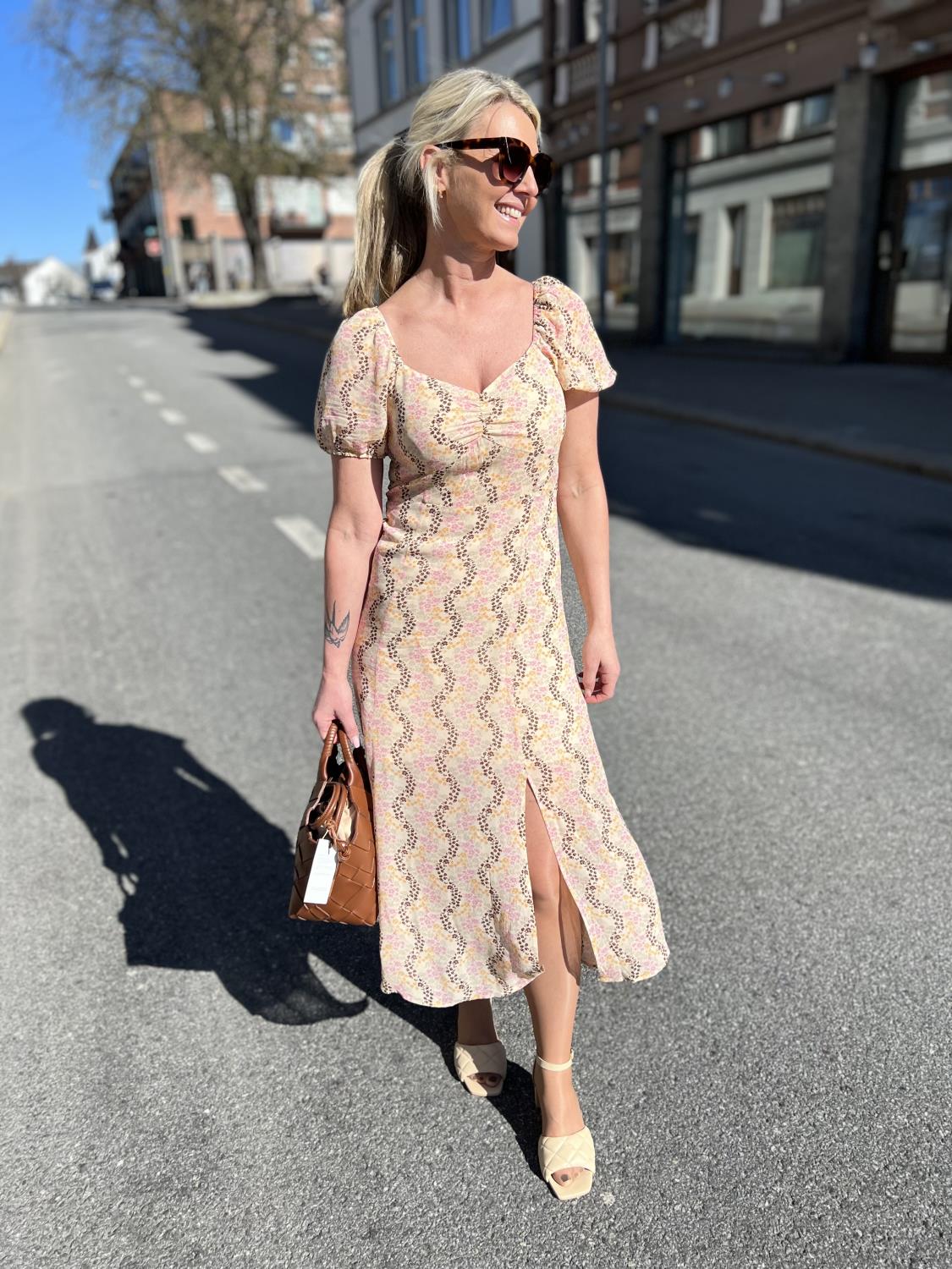 En tettsittende, halvlang kjole med nydelig print.