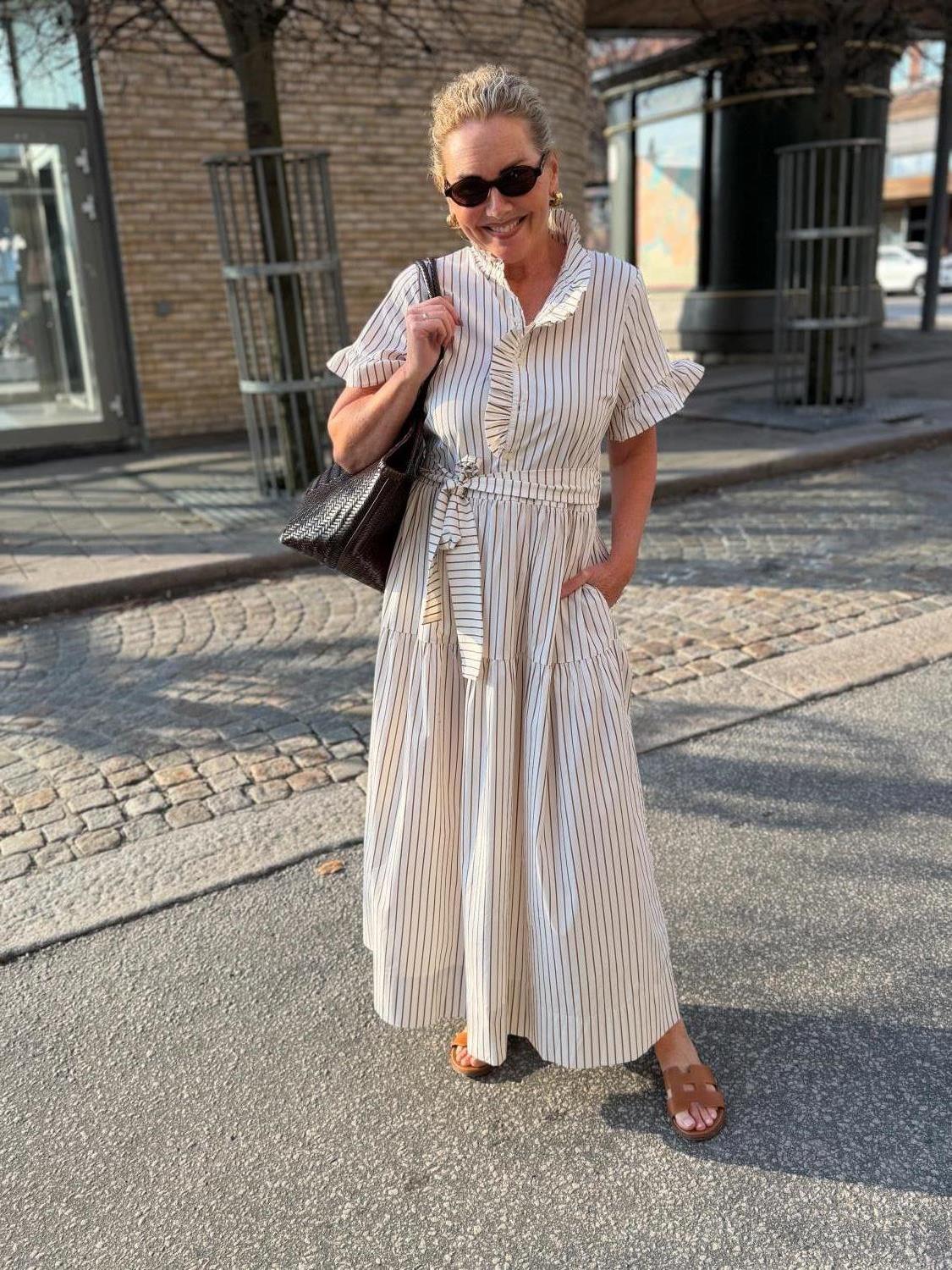 Nellie Wide Stripe Dress fra Neo Noir kombinerer et klassisk stripemønster med en moderne og avslappet silhuett.