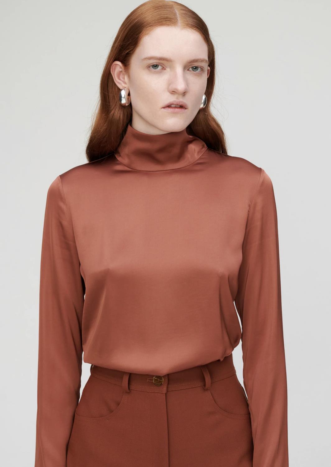 Langermet col-topp i høykvalitets flytende sateng-stretchkvalitet fra italiensk mølle Weft. Tilgjengelig i to farger. Modellen har på seg størrelse 36 og er 178 cm høy. Materialet er 94% viskose 6% elastan
