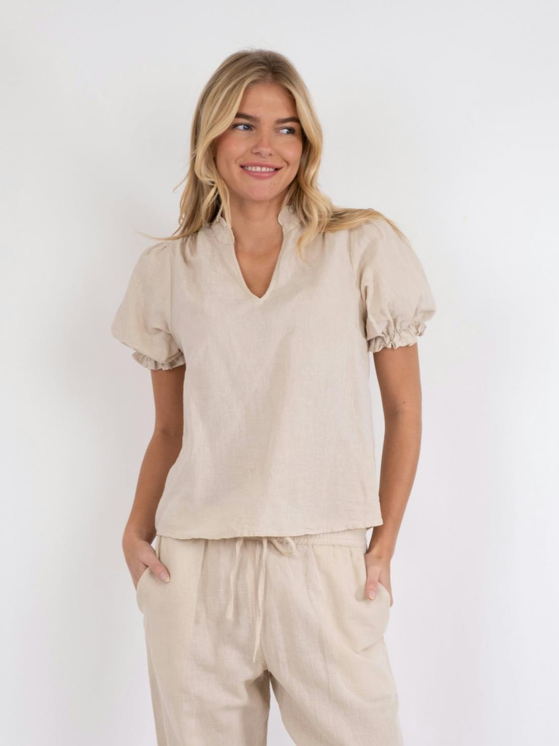 Kortermet bluse med fin volangdetalj ved krage og skulder. Blusen har åpning foran og puffdetalj ved ermet.