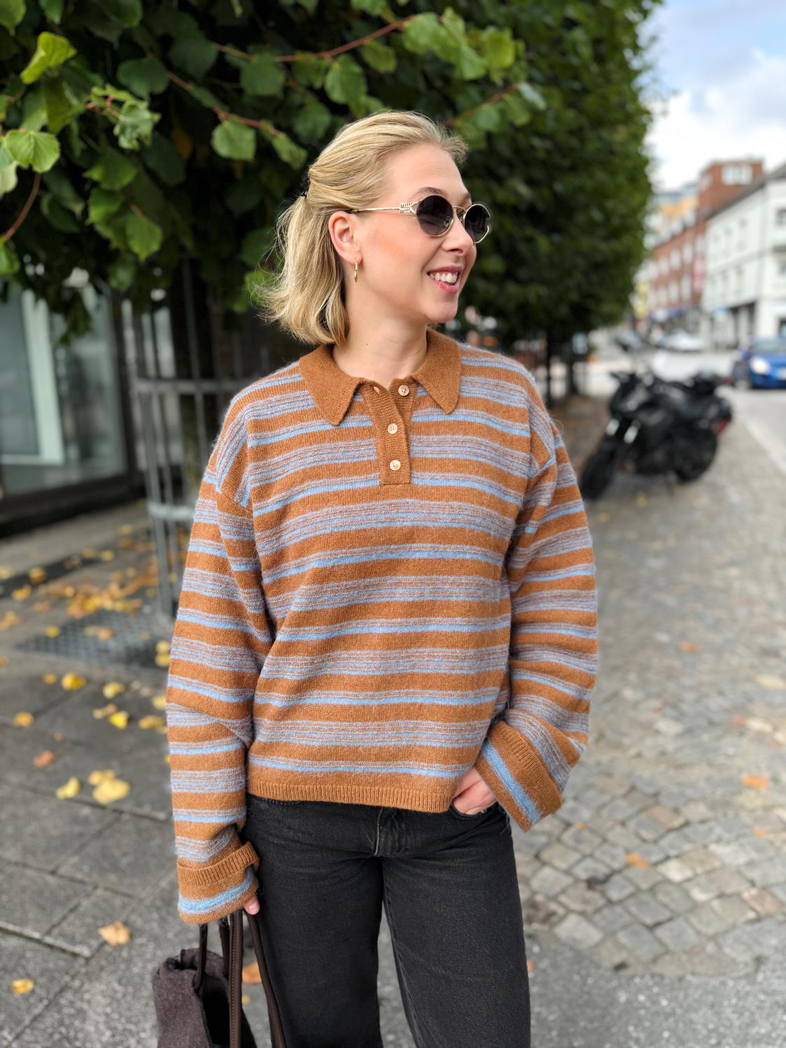 Olivia Wool Polo fra Holzweiler er laget av et taktilt, stripet strikkemateriale og har en avslappet passform. Den har en klassisk polokrage med knapper og vide ermer med klokkeform.