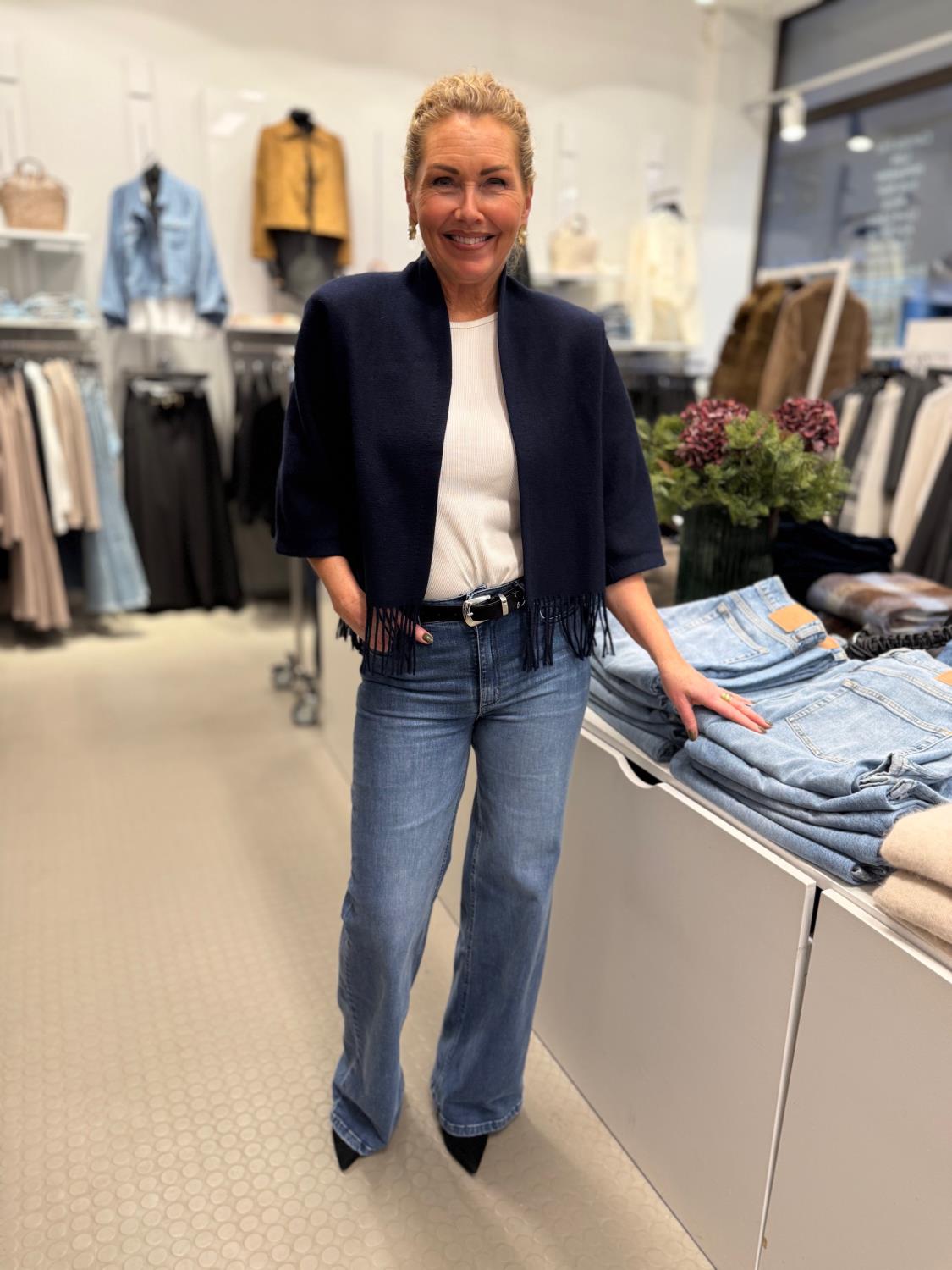 Modellen er 169 cm høy og har på seg størrelse 29/32.