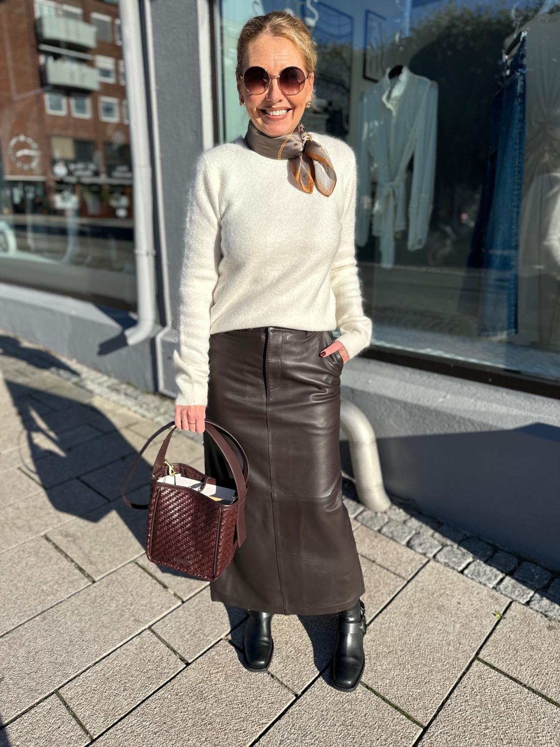 Nydelig maxiskjørt i skinn. Skjørtet har klassiske jeanslommer, linning med beltehemper og lukkes med glidelås og krok i gylfen. Et elegant skjørt som er nydelig å style med en tettsittende turtleneck eller en behagelig cardigan.