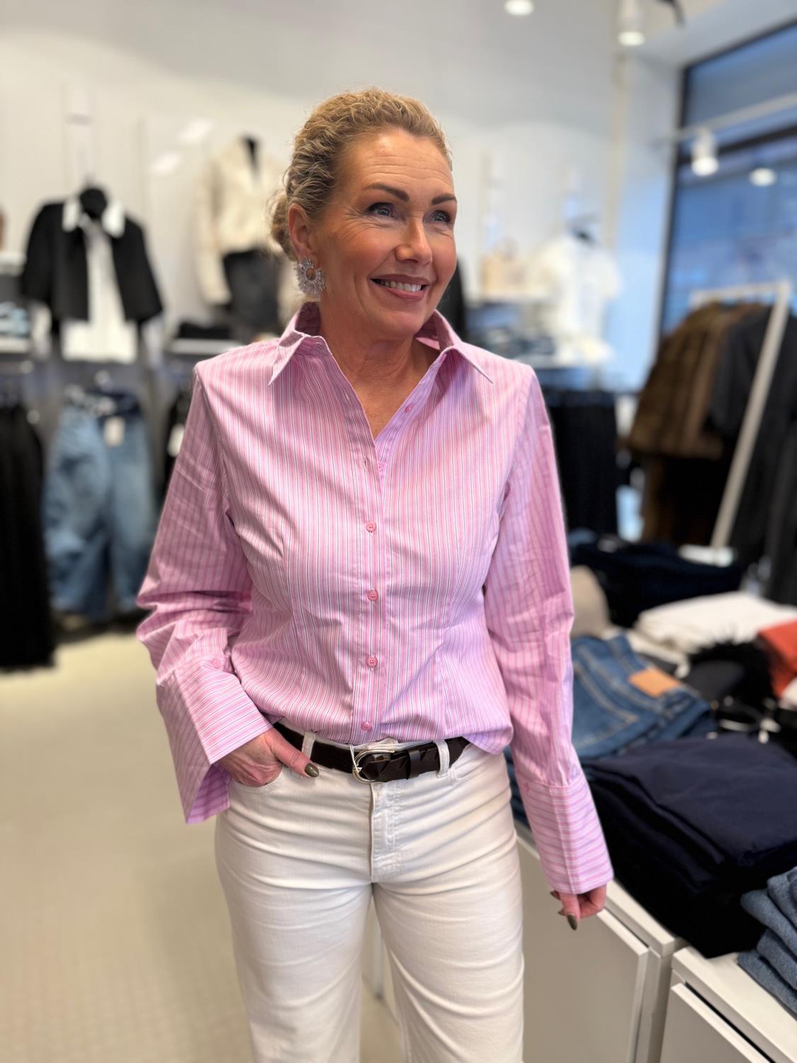 Rosa Shadow StripeShirt fra Neo Noir er en skjorte med brede ermer og mansjett. Kommer i en fin stripete kvalitet. Modellen er 169 cm høy og bruker størrelse 38.