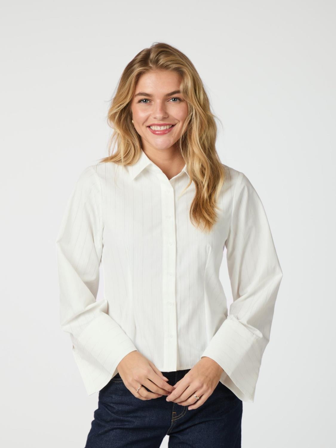 Rosa Solid shirt fra Neo Noir er en kul figursydd skjorte med vide ermer og mansjett. Modellen er 176 cm og har størrelse 36.