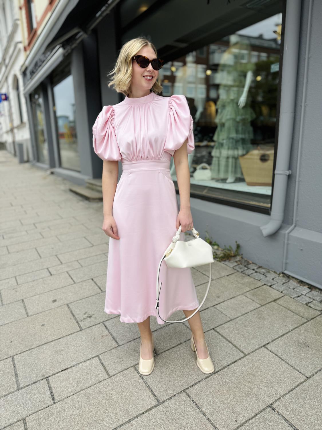 Satin puffy midi dress fra ROTATE Birger Christensen. Det er en klassisk Rotate-kjole med en råkul silhuett. Kjolen har korte, dramatiske puffermer og en noe høyere hals med knyting i nakken. Kjolen har lukket rygg med, flatterende A-linjeformet skjørt og rynkedetaljer på brystet. Kommer i en nydelig lys rosa farge. Perfekt til bryllup eller årets sommerfest.