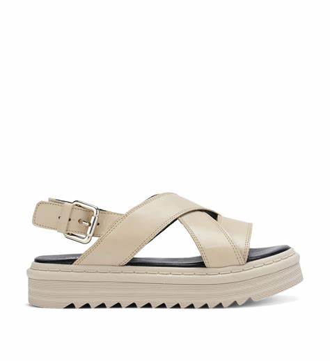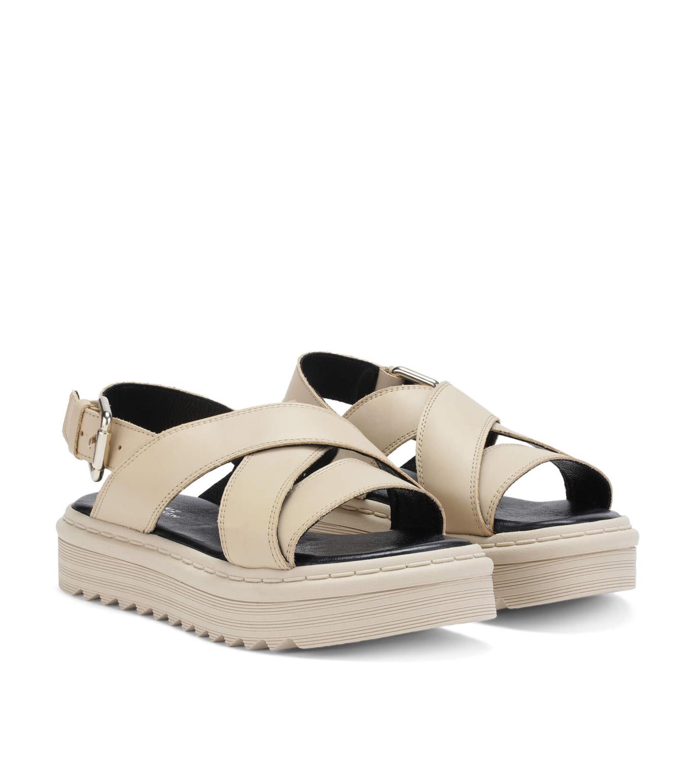Silana plain leather i fargen beige med hvit reim bak fra Shoe Biz Copenhagen. Lekker, chunky sandal i 100% skinn. Reimer over foten, reimen bak helen har mulighet for å justering. Spenne i sølv. Kraftig gummisåle.