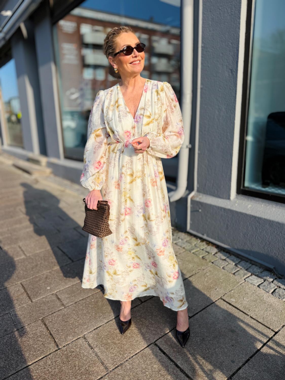 Silfi Vintage Flower dress fra Neo noir er en maxi kjole. Kjolen har en avslappet, men feminin passform. Ermene er lange og avsluttet med elastikk. Modellen er 169 cm høy og har på seg størrelse 36.