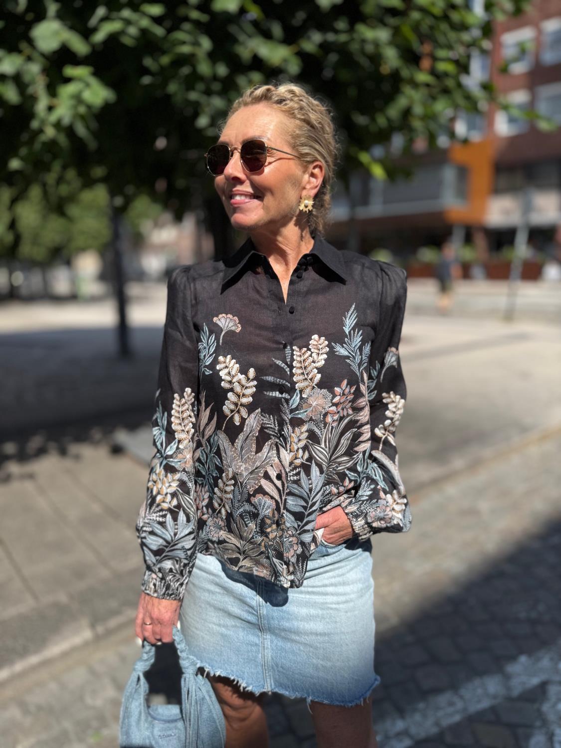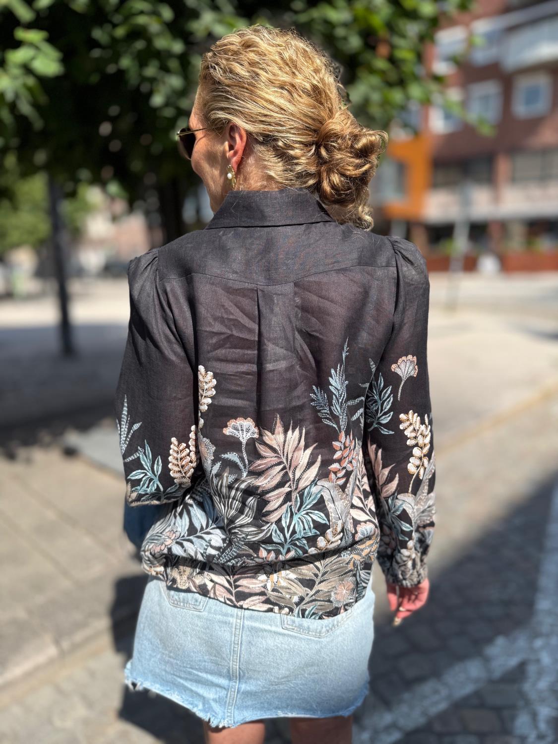 SiomaDea NS fra Dea Kudibal er en floral skjorte som kombinerer klassisk skjortedesign med et iøynefallende, kunstnerisk blomstermønster. Skjorten har en mørk, nesten transparent sort base, som gir et delikat uttrykk samtidig som det fargerike mønsteret i støvede toner av blått, beige, rosa og grønt skaper et levende og sofistikert blikkfang.