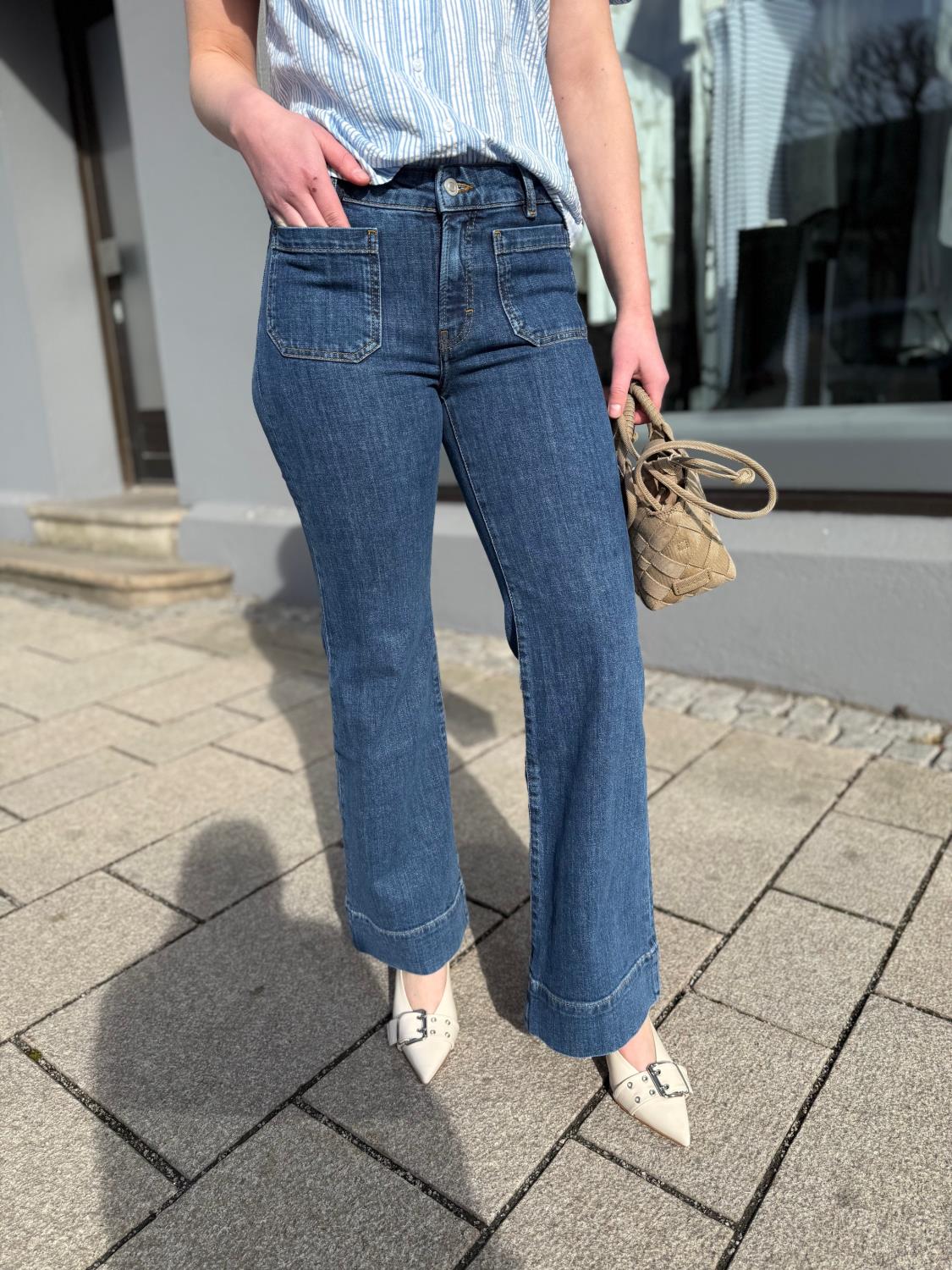 St Monica Low fra Jeanerica er en low-rise versjon av den ikoniske St Monica modellen. Jeansen har full lengde med vide ben og lavt liv i en mørkeblå vask. To store lommer bak og to mindre lommer foran i samme stil som skaper en kul look. God stretch.